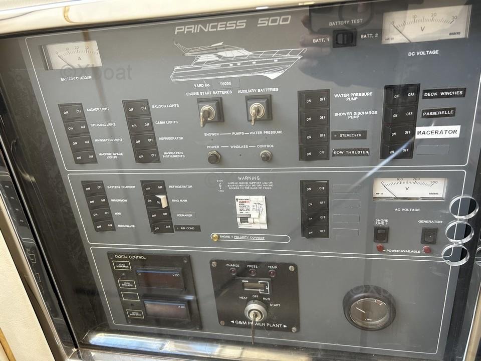 El Princess 500 también está equipado con numerosos equipos de cubierta, entre ellos una pasarela hidráulica, unos brazos de grúa, un ancla eléctrica, y una toldo de cockpit. El cockpit es de teca, añadiendo un toque de elegancia y confort.