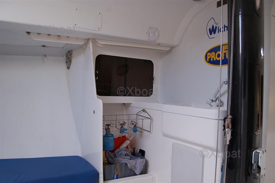 En el interior, el barco ofrece un espacio de vida cómodo con una cabina principal, una cocina equipada y alojamiento para hasta 6 personas. Los acabados interiores son meticulosos, con materiales de alta calidad para un confort óptimo en el mar.