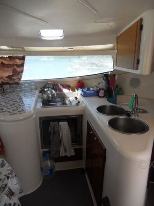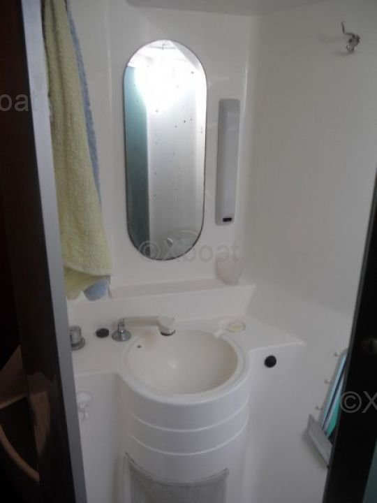 El Athena 38 ofrece una distribución interior acogedora con 4 camarotes dobles y 2 baños. La sala de estar es espaciosa y luminosa, con una gran mesa de cartas y un área de asientos cómoda. La cocina está bien equipada con un fregadero doble, un refrigerador y un horno.