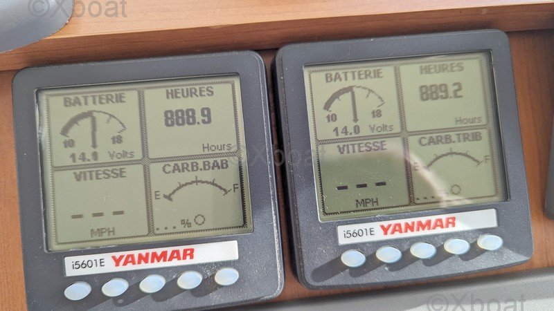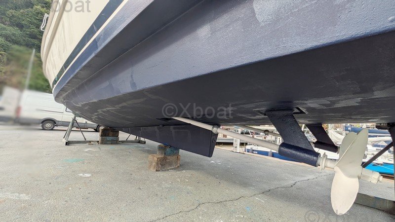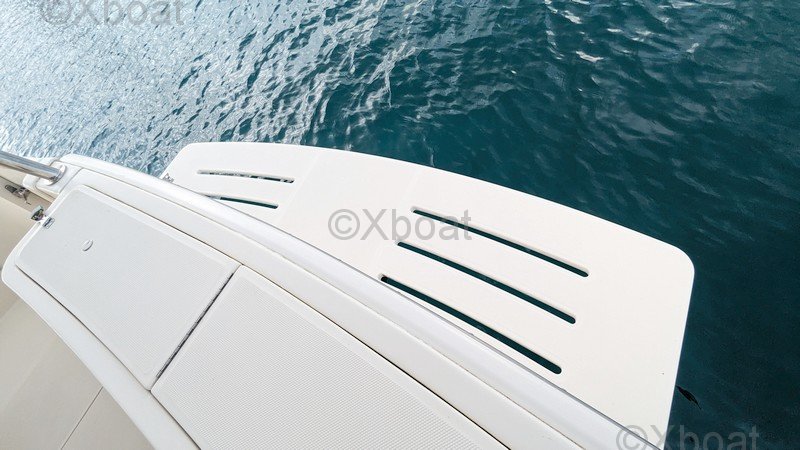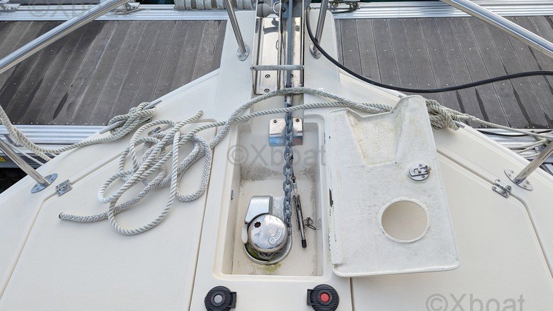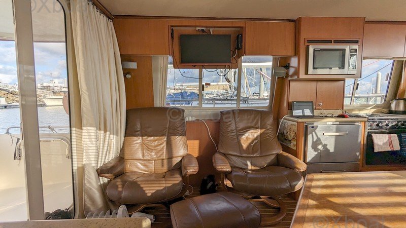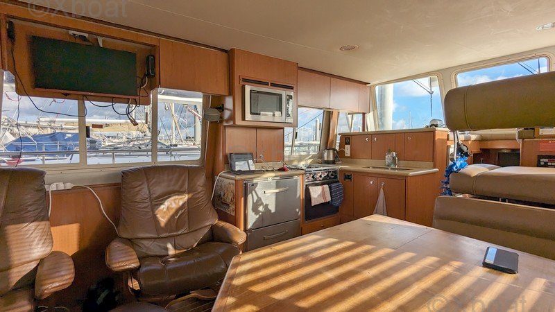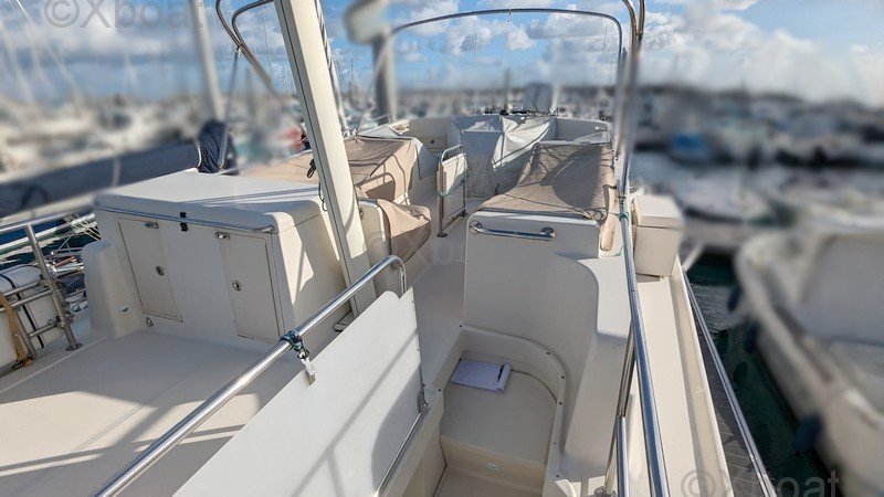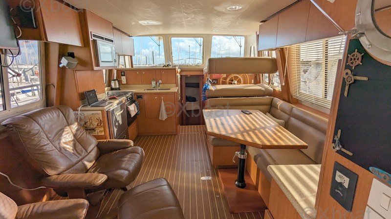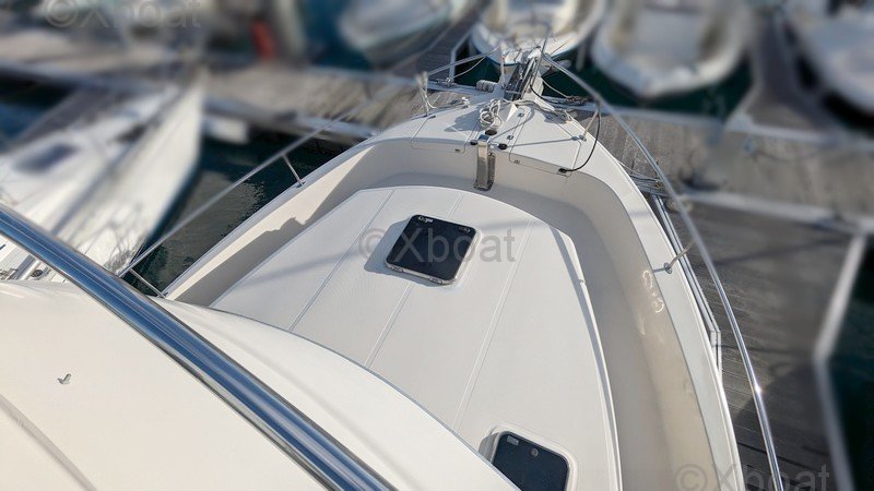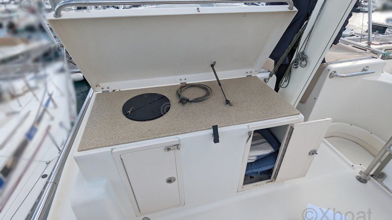 Comodidad y ocio: La cubierta principal es espaciosa y ofrece áreas de relax, con asientos y mesas plegables. La cockpit está protegida por un techo rígido, proporcionando refugio contra los elementos. Una barbacoa integrada y una nevera permiten disfrutar plenamente de los momentos de relajación a bordo.