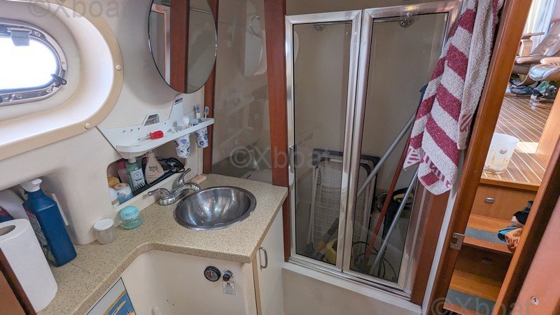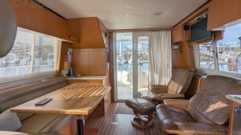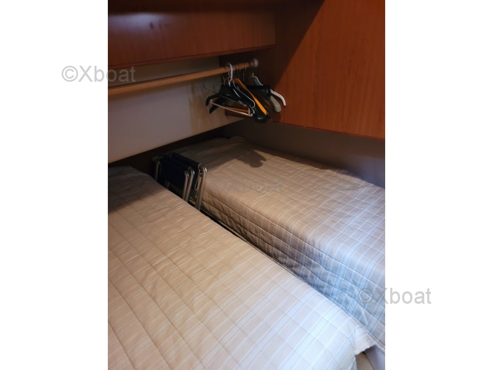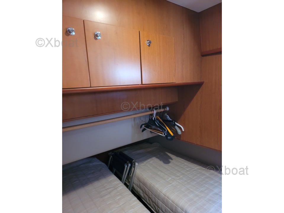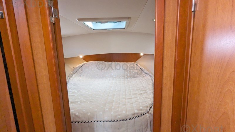 Distribución interior: La embarcación cuenta con tres cabinas, incluyendo una suite del propietario en la proa, una cabina para invitados y una cabina adicional, proporcionando el máximo confort para largos viajes. El baño está equipado con duchas separadas y retretes eléctricos.