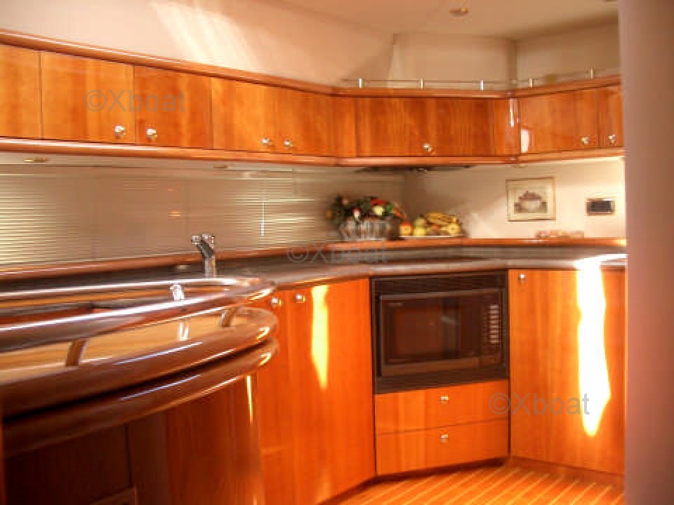 La cubierta principal cuenta con un salón y un comedor espacioso, mientras que la cubierta superior ofrece una zona de relax al aire libre con un salón y una barra. La popa está equipada con asientos cómodos y un sistema de navegación avanzado.