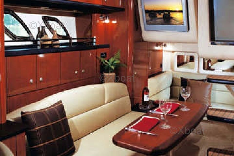 Diseño interior: El Sea Ray 355 Sundancer ofrece amplios espacios habitables con una cómoda cabina principal, una cocina bien equipada, un baño completo y una sala de estar que se convierte en espacio adicional para dormir. La cubierta de popa es generosamente espaciosa, ideal para comer al aire libre y relajarse.