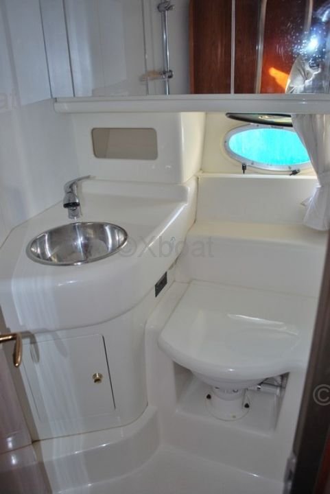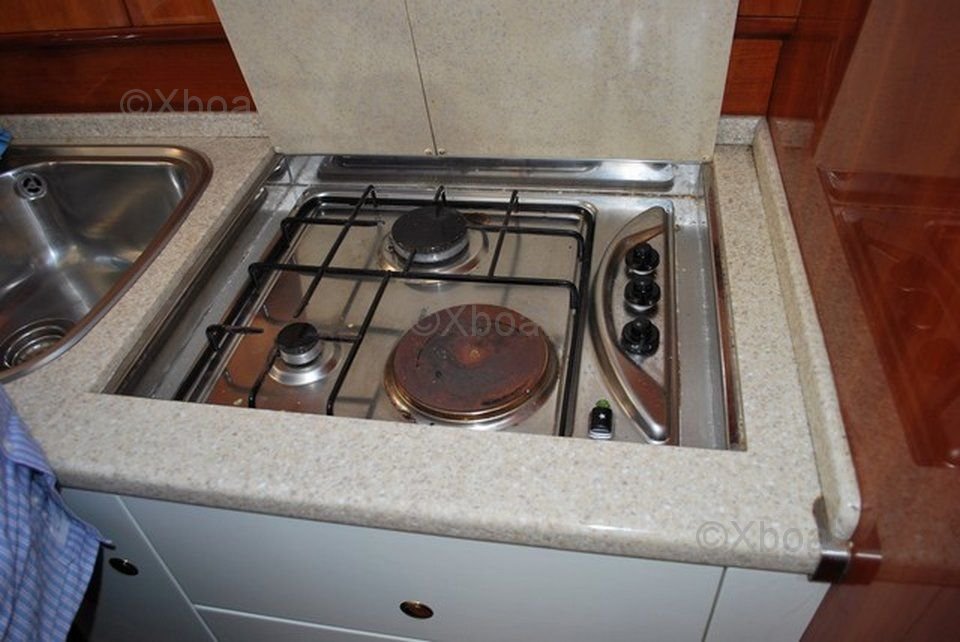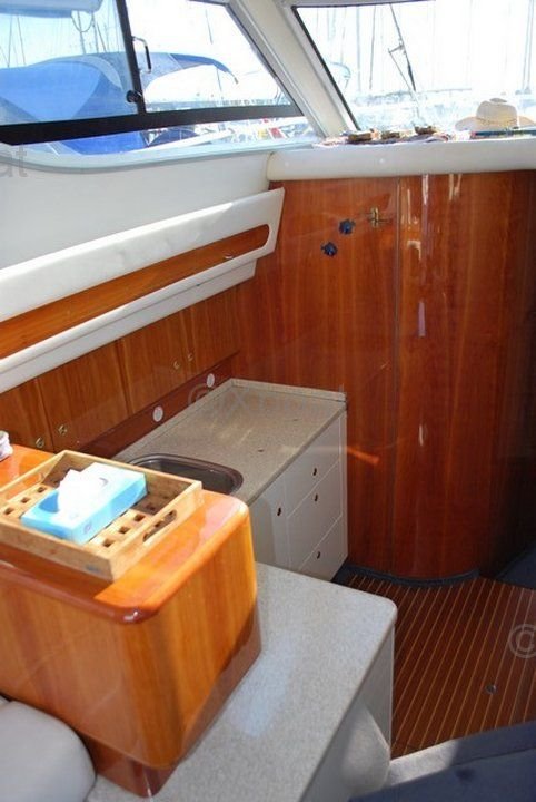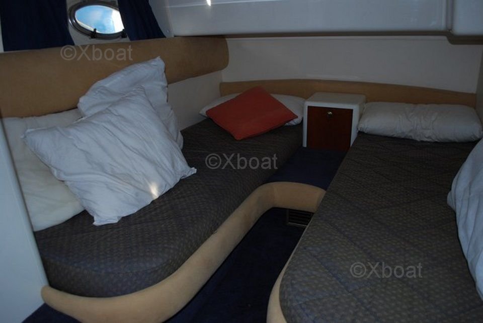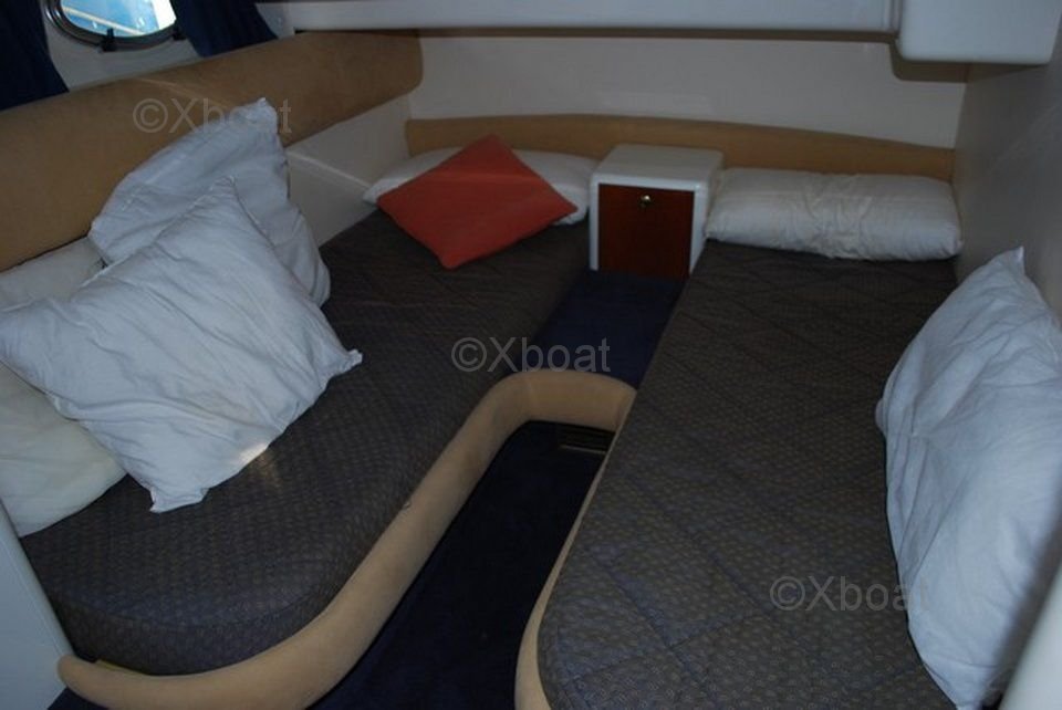 Distribución interior: El barco cuenta con tres cabinas, incluyendo una cabina principal con una cama doble, una cabina de proa con dos camas individuales y una cabina de popa. El baño está equipado con ducha y inodoros eléctricos. La cocina está bien equipada con refrigerador, congelador, fregadero y fogones.