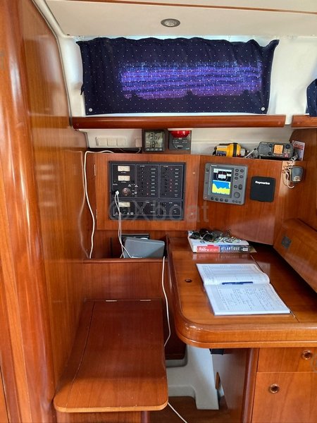 Un repetidor Raymarine en el salón, un repetidor de estribor Raymarine i50 Tridata (2022), una antena VHF, una VHF RT 650 Navicom (2010) con receptor AIS y combinado externo, una VHF portátil RT 411 con cargador, un radar Raymarine (pantalla en el salón), y 2 compases magnéticos completan el equipo de navegación.