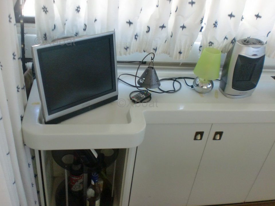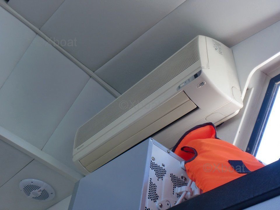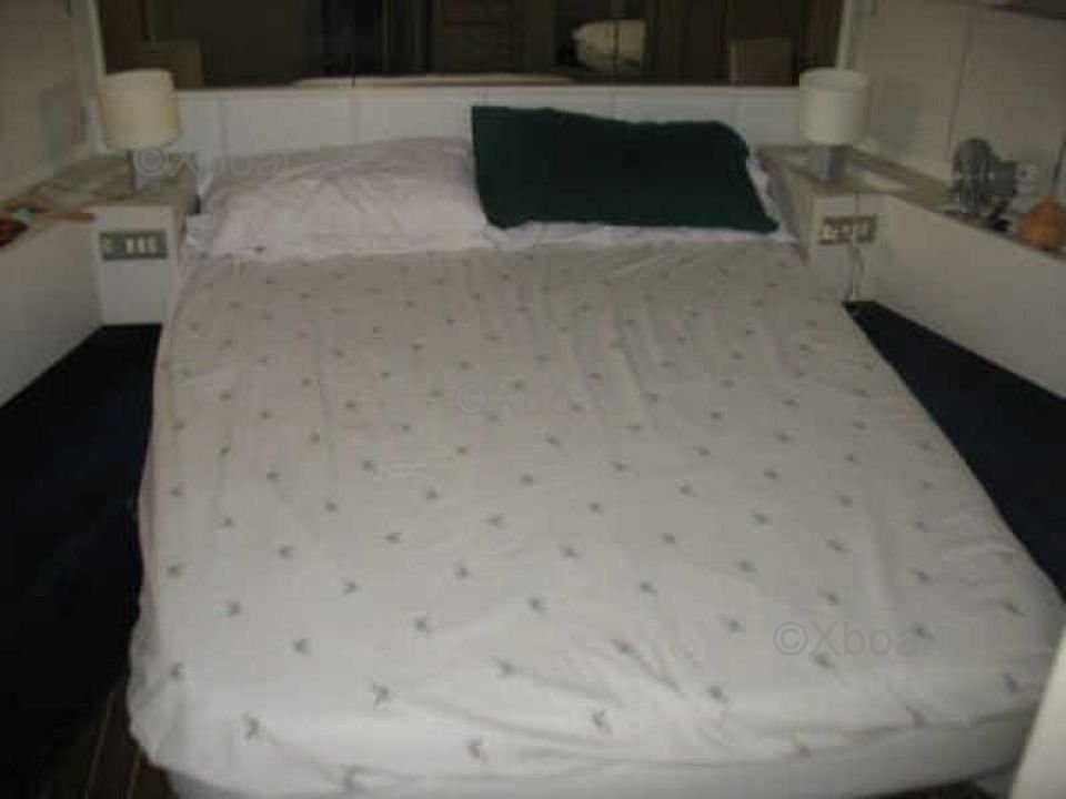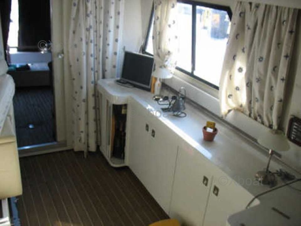 En el interior, el barco cuenta con tres cabinas espaciosas, alojando hasta seis personas. La cabina principal está equipada con una cama doble, mientras que las dos cabinas de invitados tienen camas individuales. El baño está equipado con ducha y inodoros eléctricos.