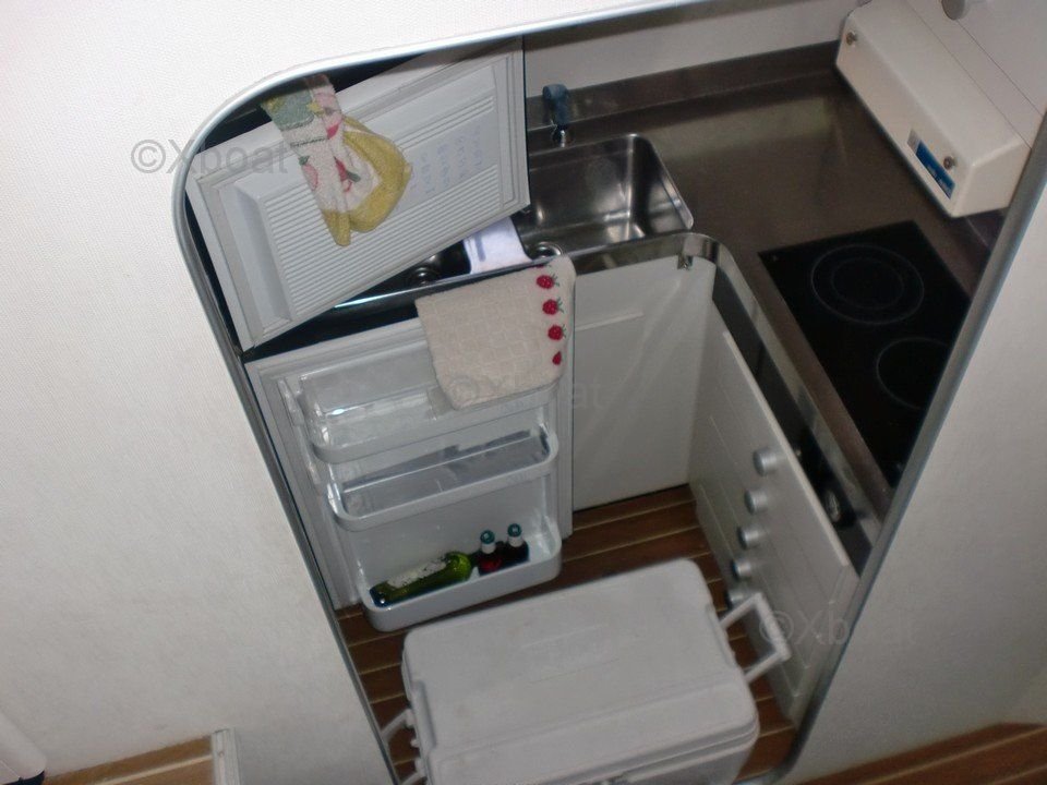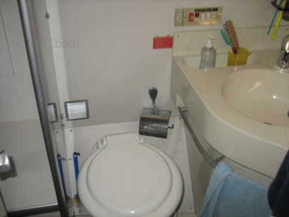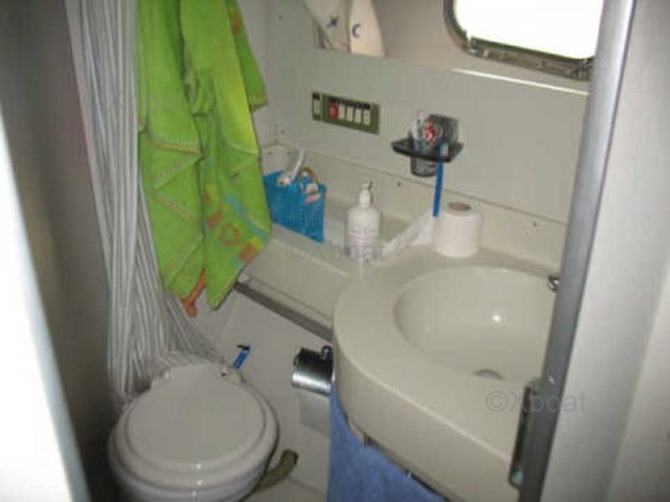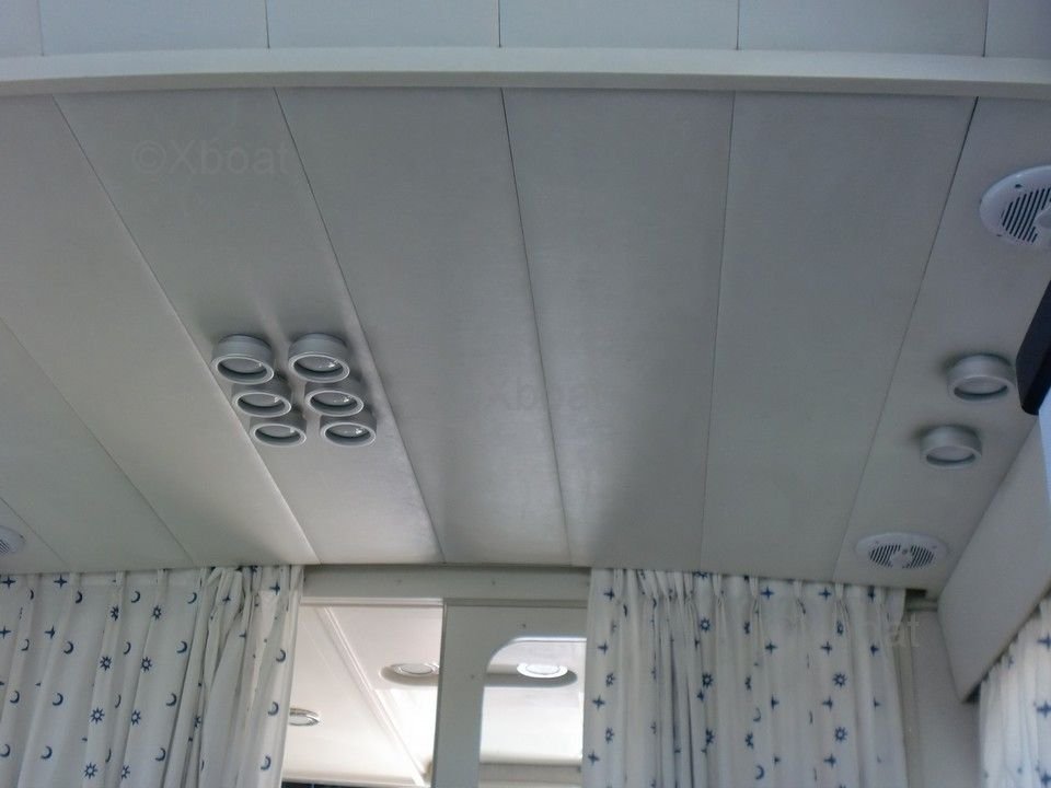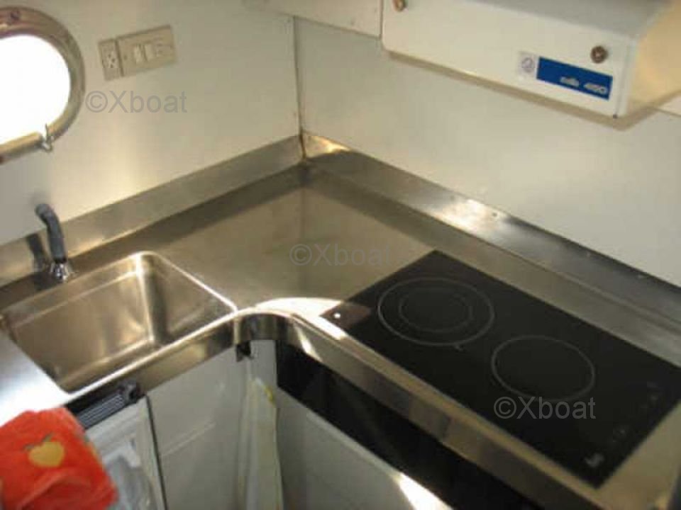 En el interior, el barco cuenta con tres cabinas espaciosas, alojando hasta seis personas. La cabina principal está equipada con una cama doble, mientras que las dos cabinas de invitados tienen camas individuales. El baño está equipado con ducha y inodoros eléctricos.