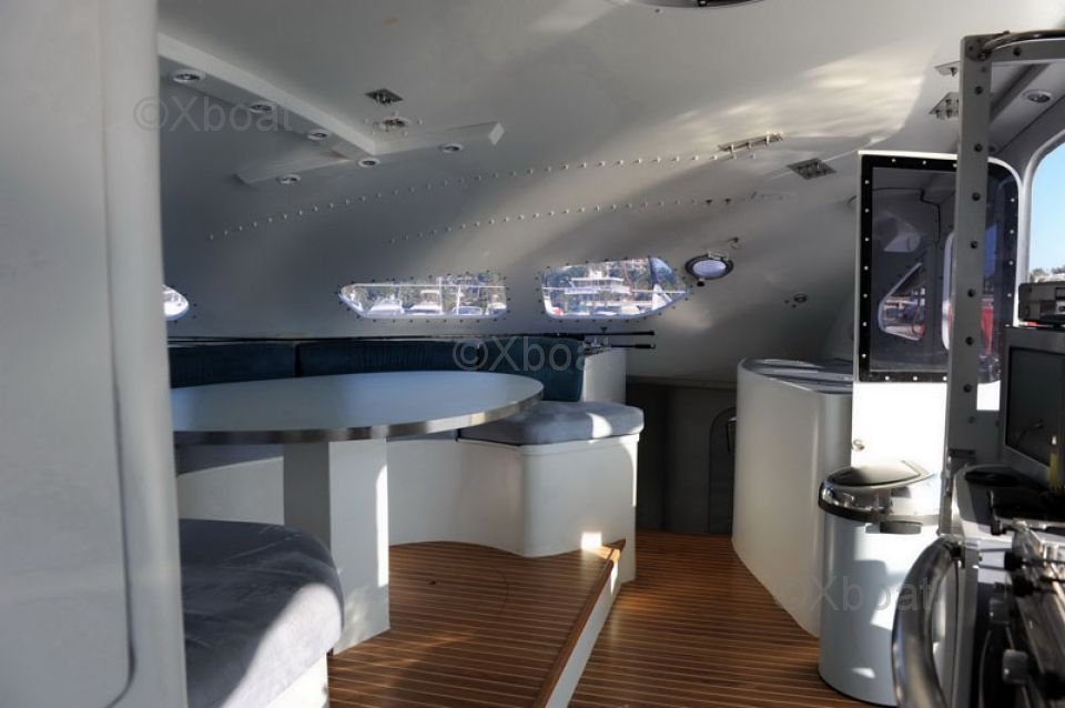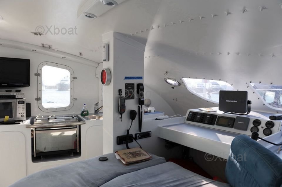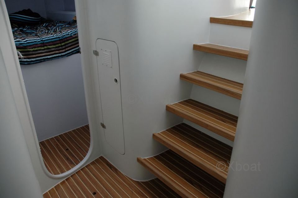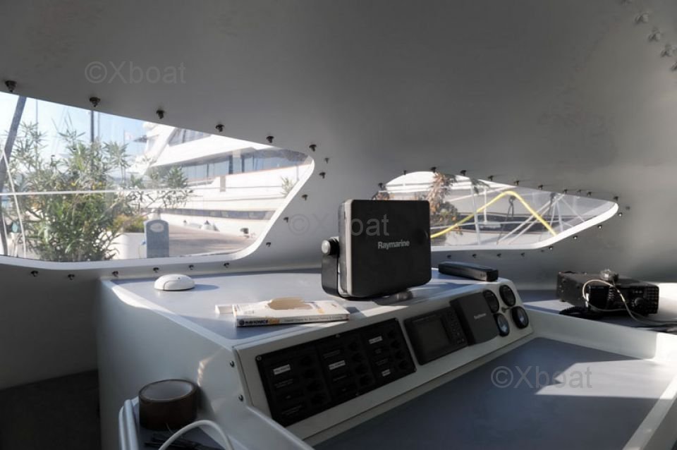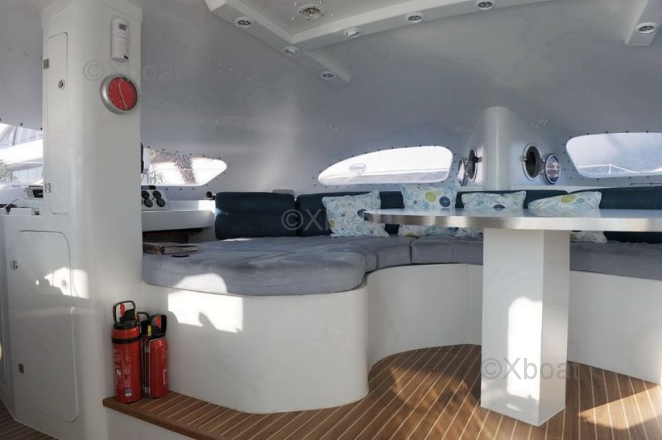 La cubierta es amplia y ofrece numerosos espacios para relajarse o navegar. Las poleas y maniobras están bien colocadas para una navegación intuitiva y agradable. El cockpit está protegido y ofrece una excelente visibilidad para el timonel.