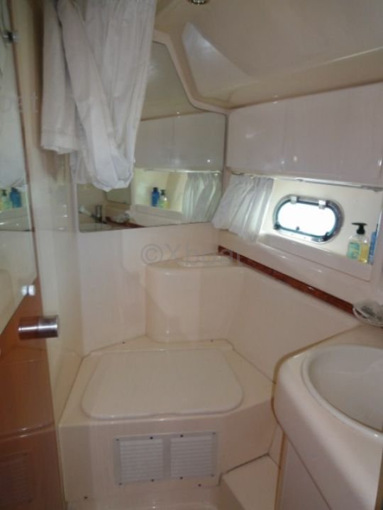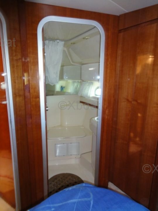 Distribución interior: El yate cuenta con dos cabinas dobles, cada una ofreciendo un espacio de vida cómodo y elegante. La cabina principal está equipada con un baño privado, mientras que la segunda cabina comparte un baño con el salón.