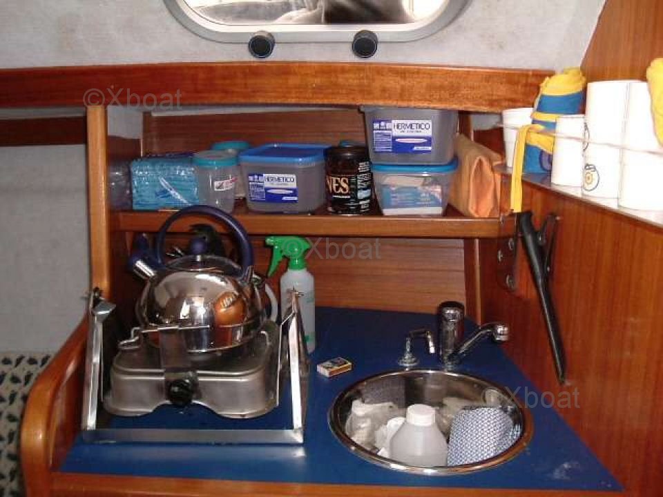 El Gib'Sea 334 CL ofrece un interior espacioso y bien diseñado, con una cabina principal cómoda y alojamiento para hasta 6 personas. La cocina está bien equipada, con un fregadero, un refrigerador y una estufa de gas. El baño es separado, proporcionando mejor privacidad.