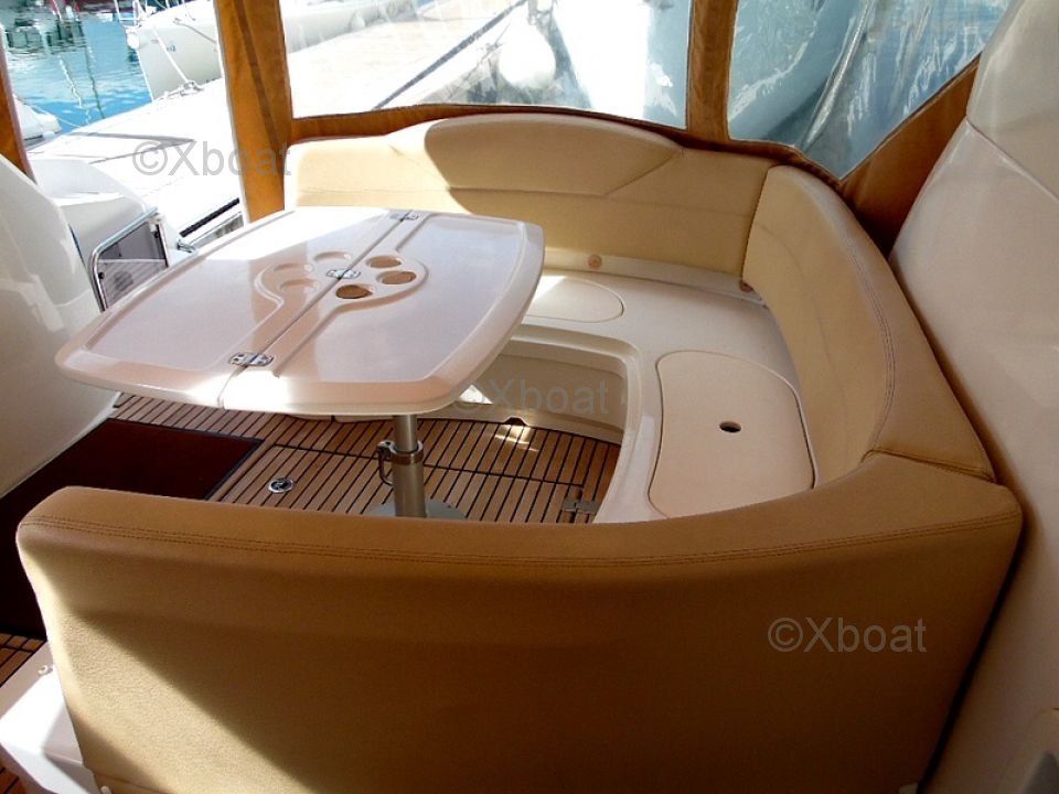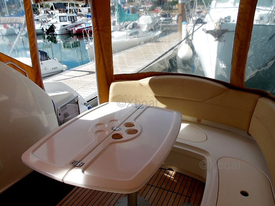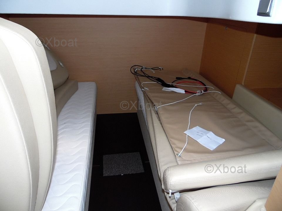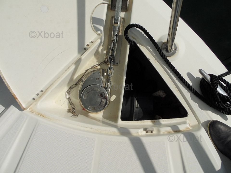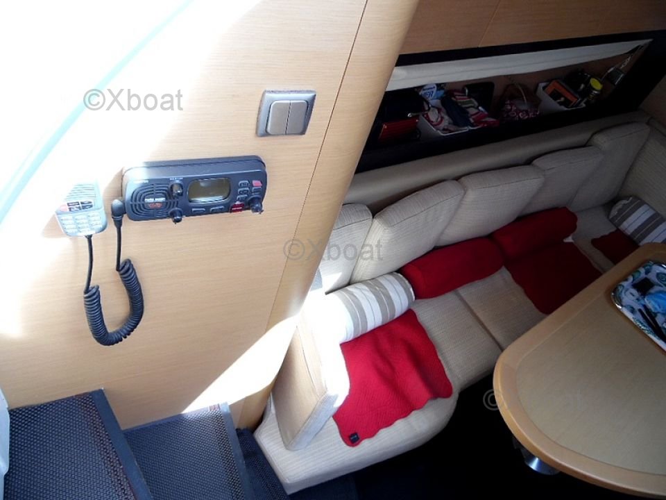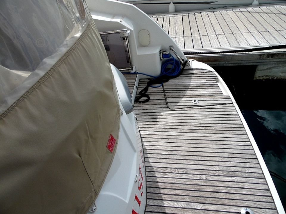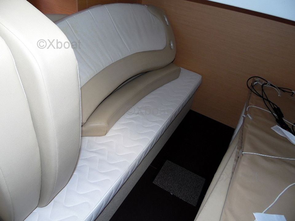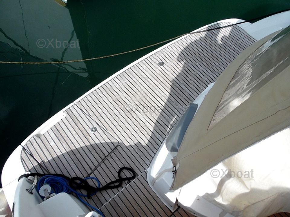 Distribución exterior: La cubierta de popa es grande y bien diseñada, ofreciendo un espacio de vida agradable para relajarse. La proa también es espaciosa y puede transformarse en una gran zona de sol. El barco está equipado con un sistema de dirección hidráulica y un sistema de propulsión eléctrica, facilitando las maniobras.