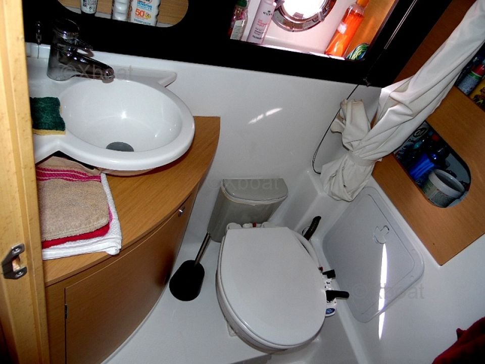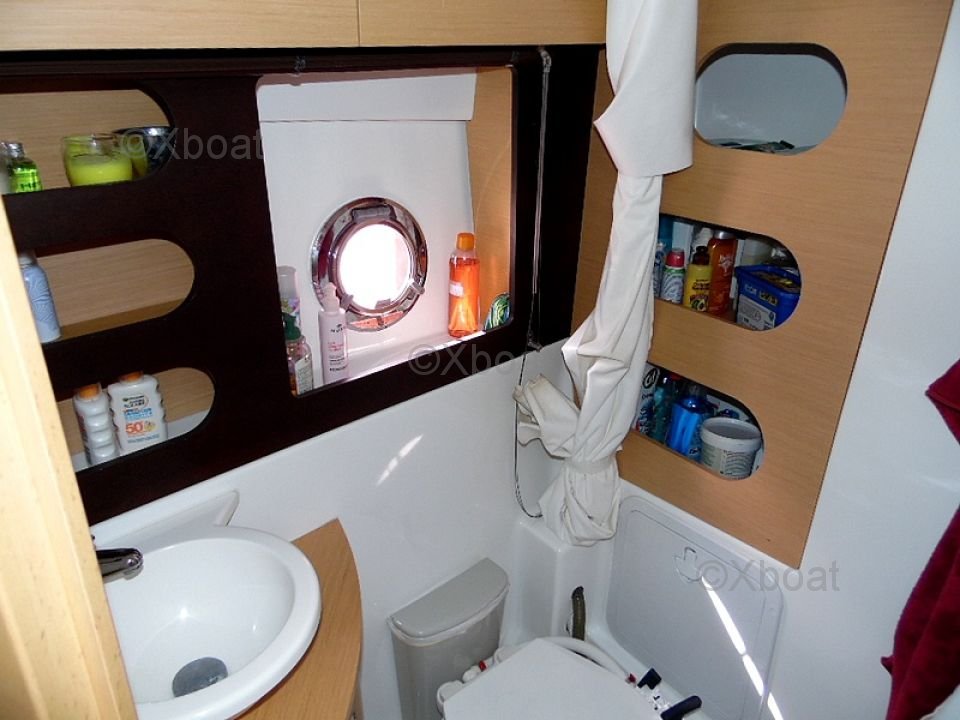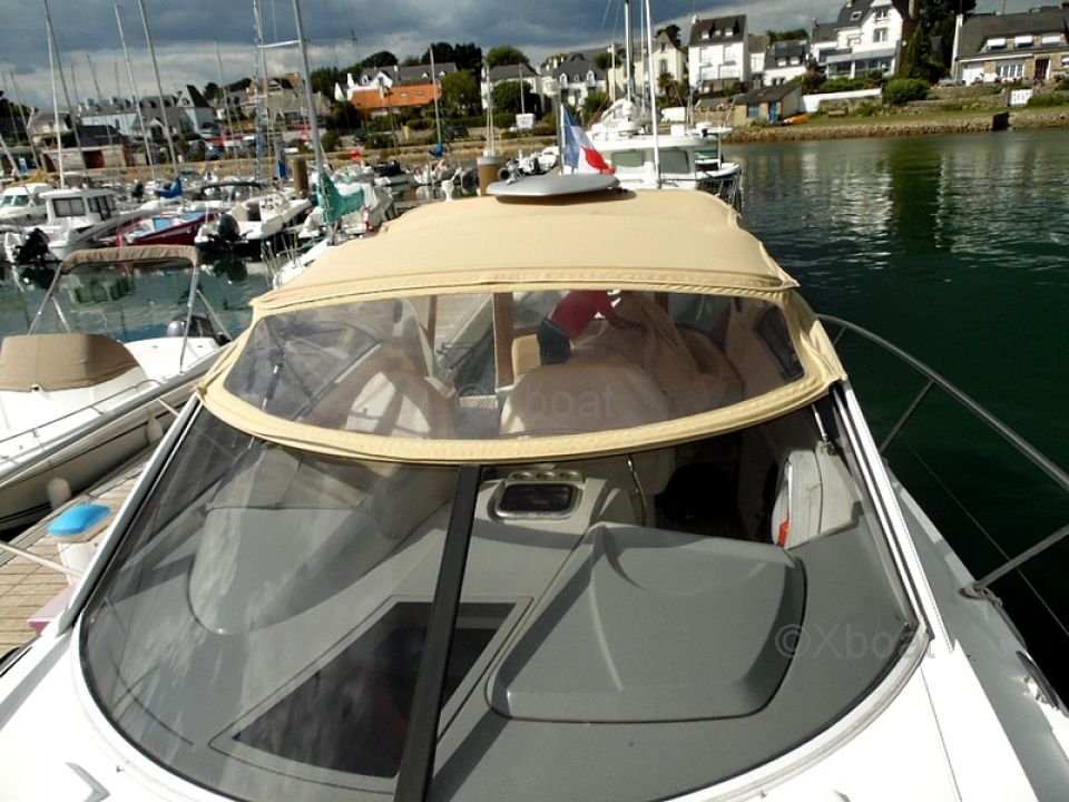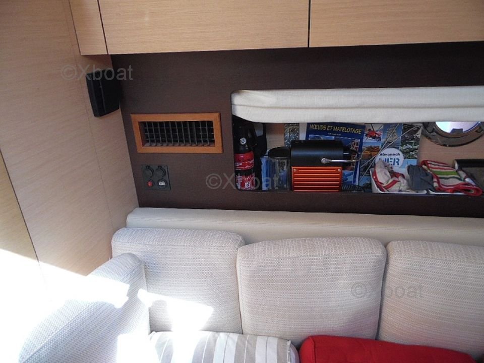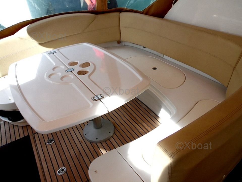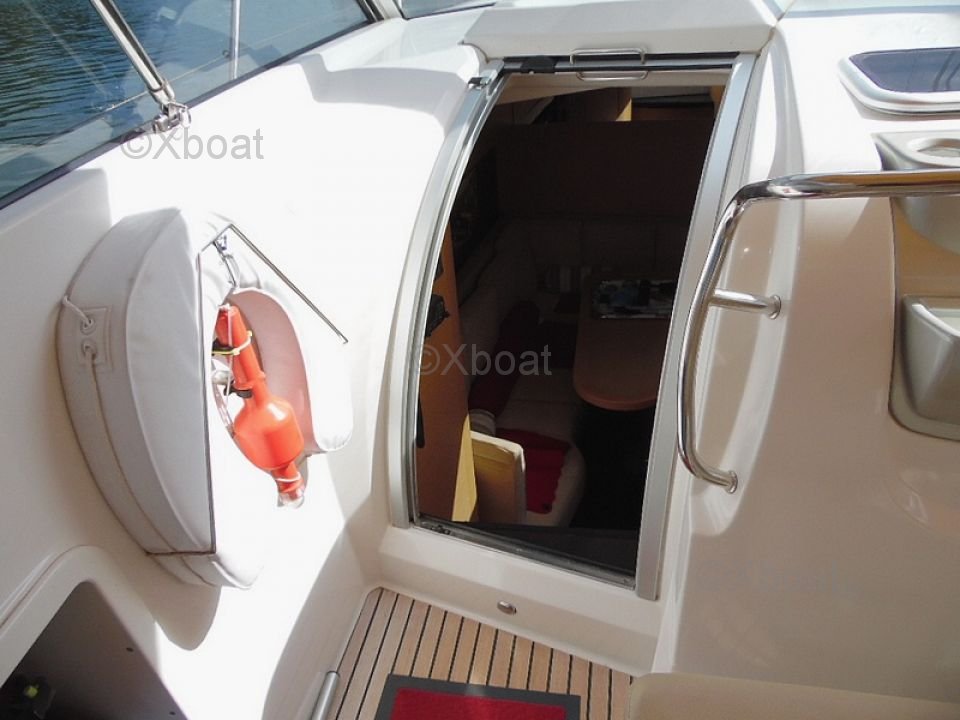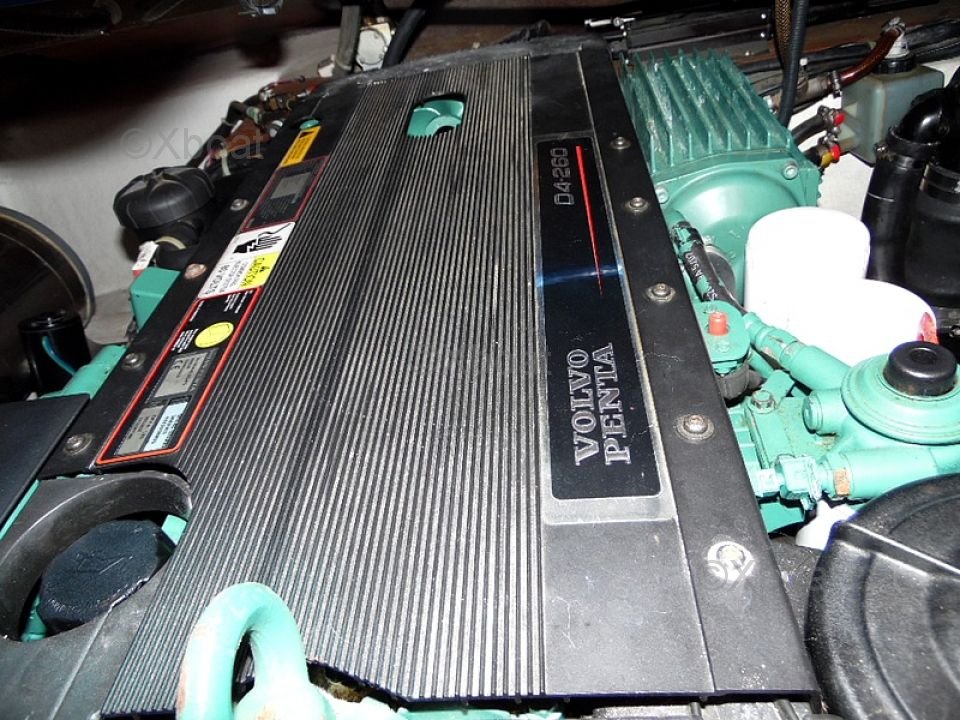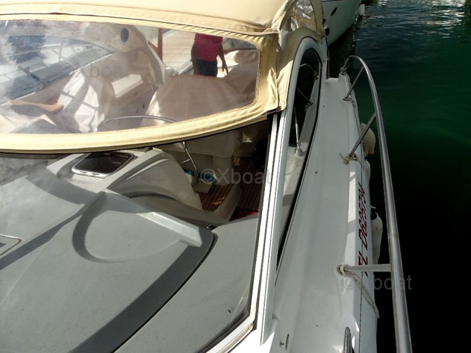 Distribución exterior: La cubierta de popa es grande y bien diseñada, ofreciendo un espacio de vida agradable para relajarse. La proa también es espaciosa y puede transformarse en una gran zona de sol. El barco está equipado con un sistema de dirección hidráulica y un sistema de propulsión eléctrica, facilitando las maniobras.
