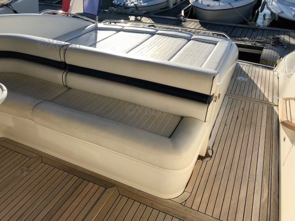 Distribución exterior: La cubierta principal es espaciosa y ofrece numerosas opciones de relajación, incluyendo un salón al aire libre con una mesa de comedor, bancos y un área de barbacoa. La flybridge es ideal para los días soleados, con un área de pilotaje, asientos y una cama de sol.
