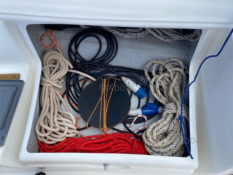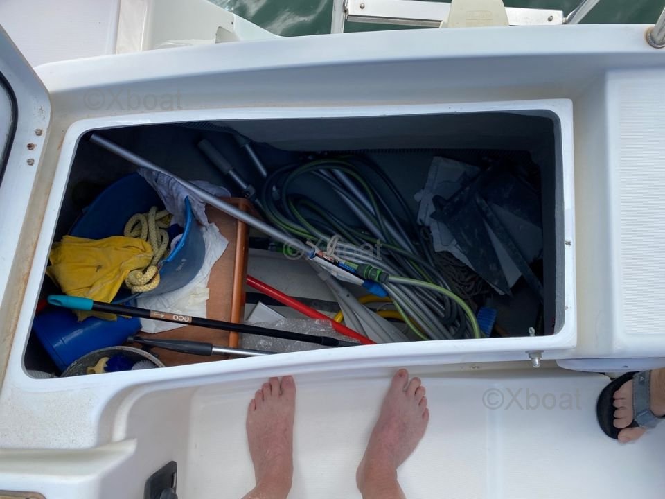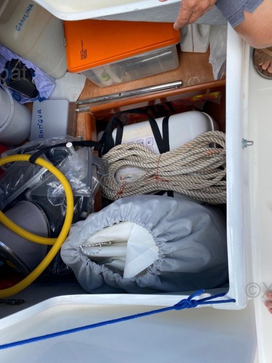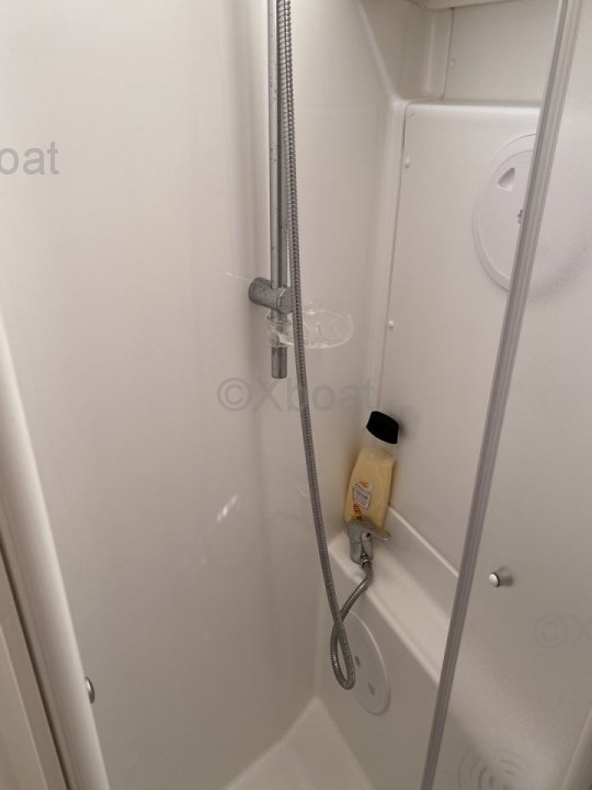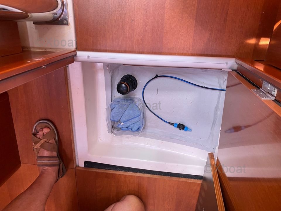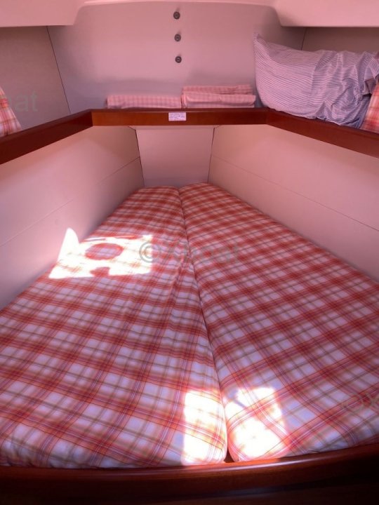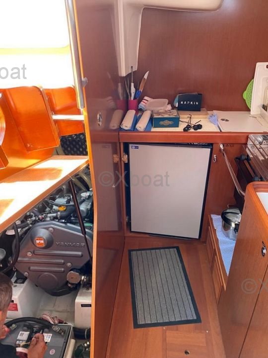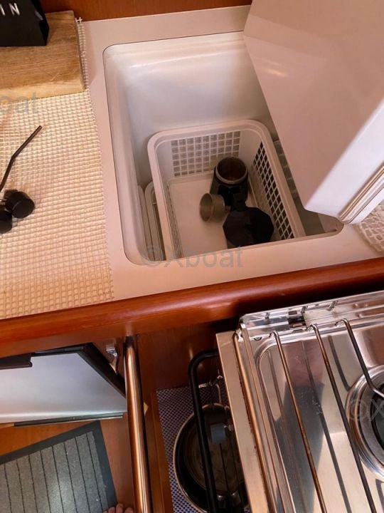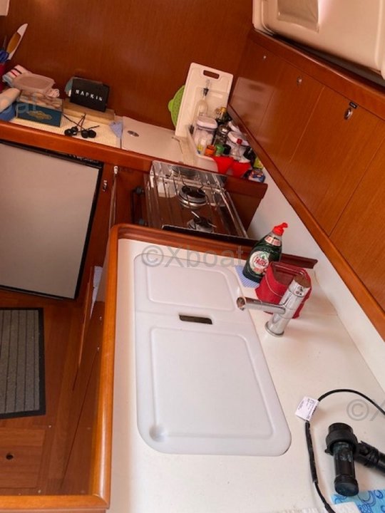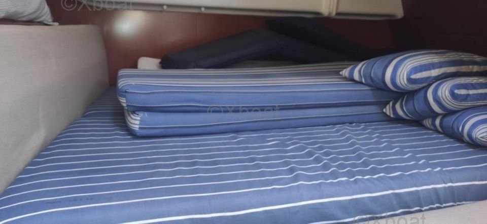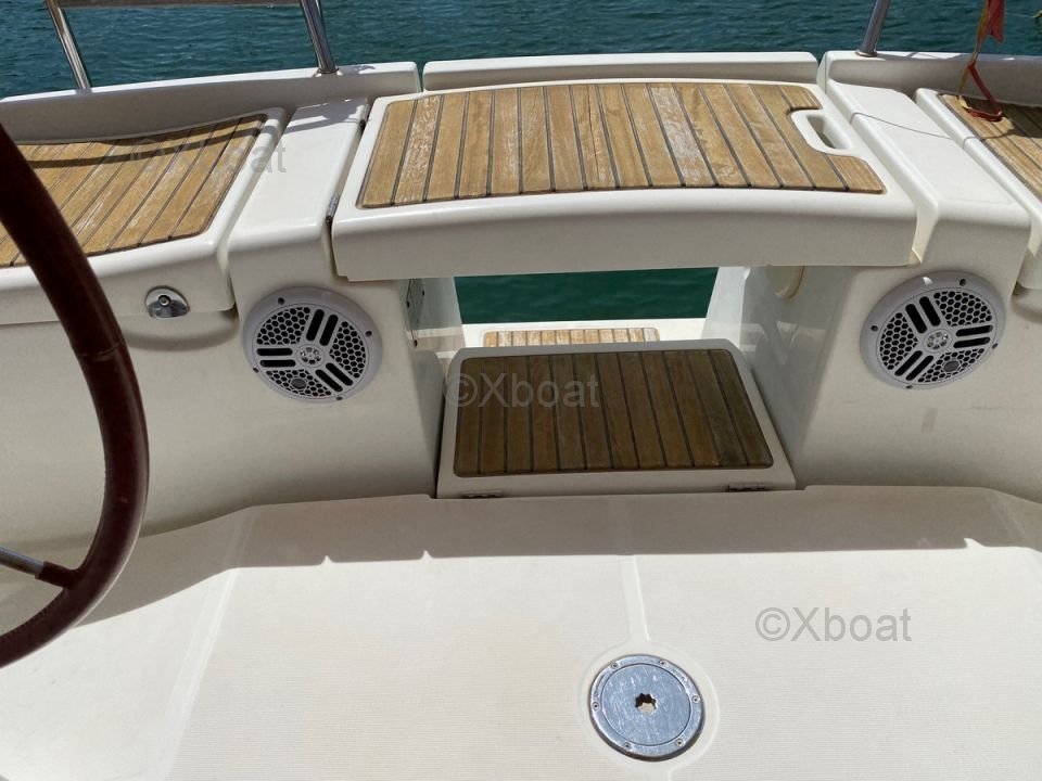 En el interior, el barco ofrece una distribución cómoda con cabinas espaciosas y una cocina bien equipada. El diseño interior es moderno y funcional, con acabados de alta calidad.