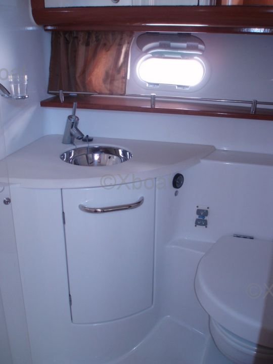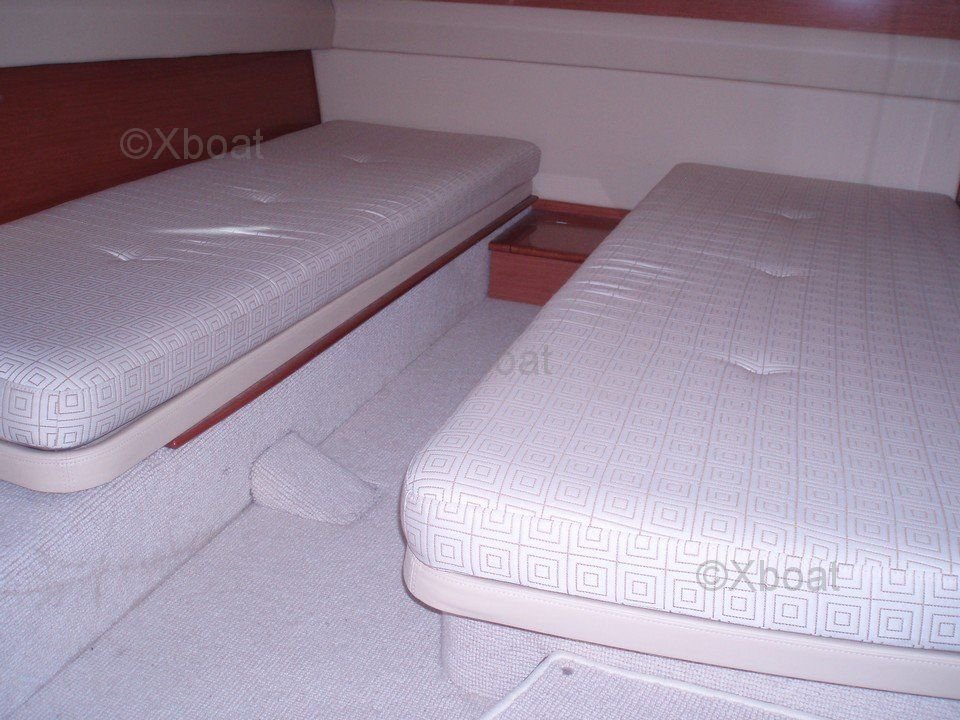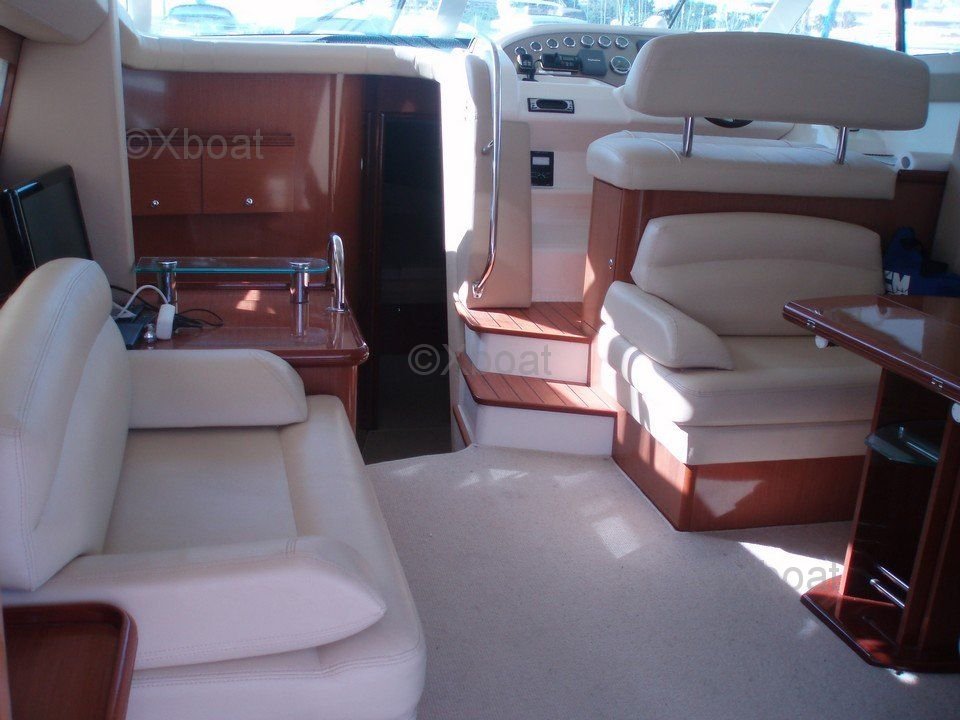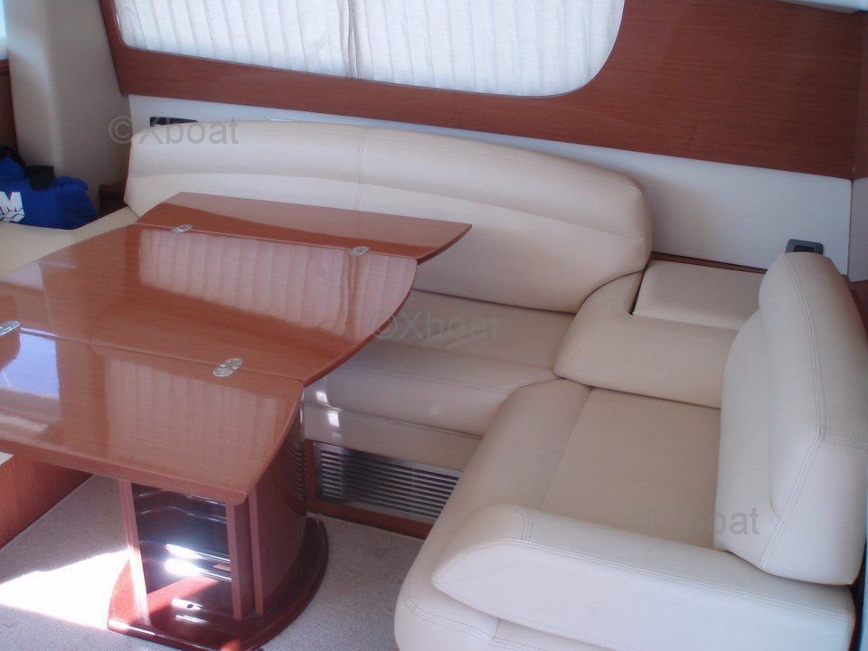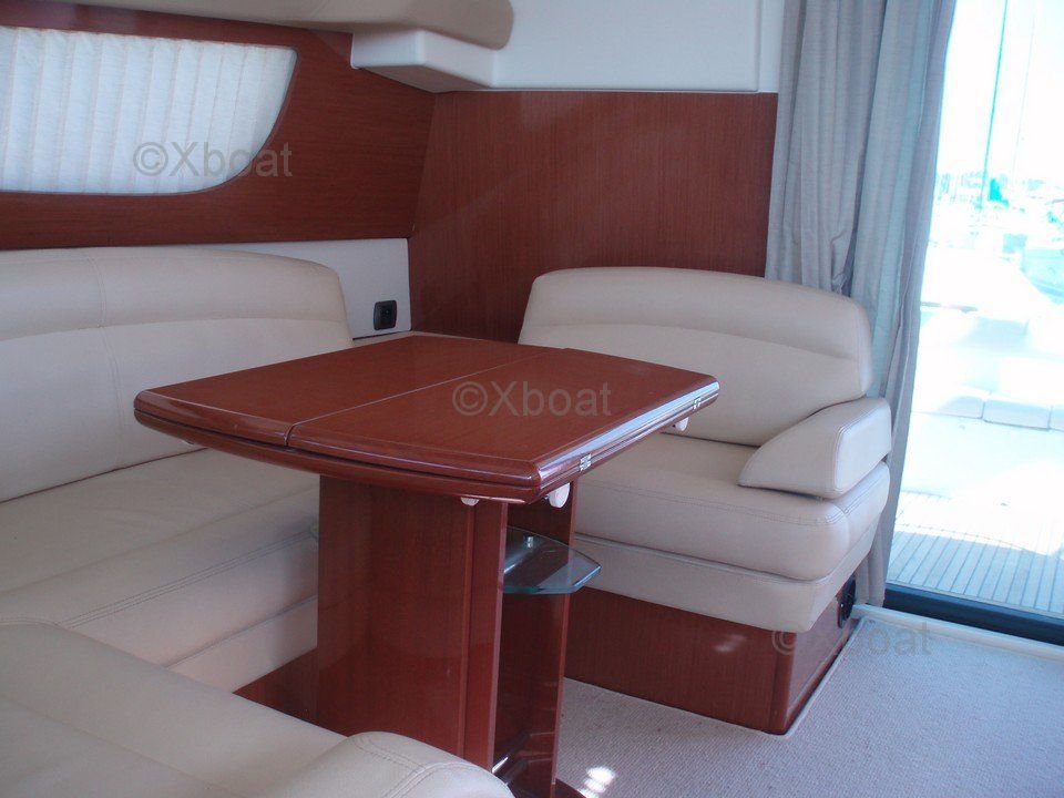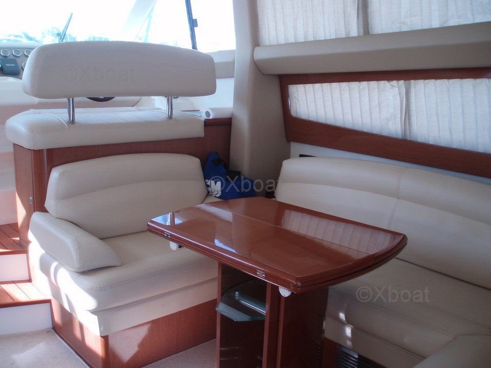 Distribución interior: El interior del Prestige 42 es espacioso y luminoso, con acabados de madera de alta calidad. La sala de estar está equipada con asientos cómodos y una mesa de comedor, ofreciendo un espacio de vida acogedor. La cocina está bien equipada con electrodomésticos modernos. Las cabinas son espaciosas, con camas dobles y amplio almacenamiento. La cabina principal cuenta con un baño privado con ducha.