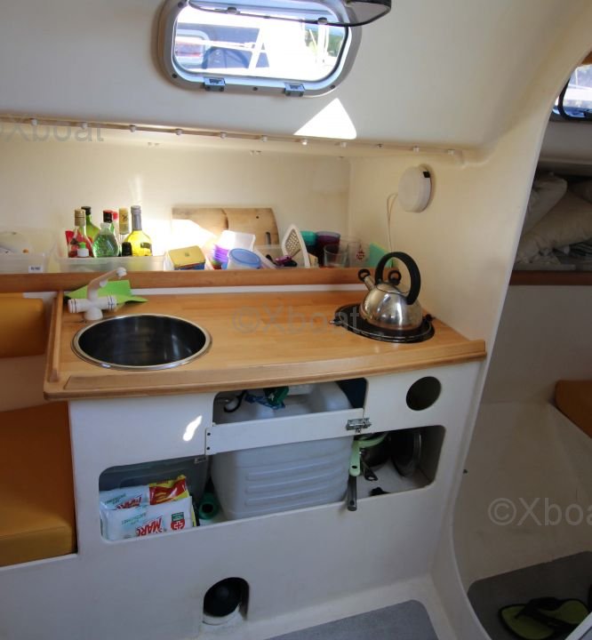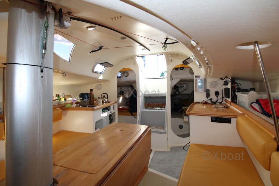 El interior del Pogo 850 está diseñado para ofrecer el máximo confort. Cuenta con una amplia zona de estar con cómodos camarotes y una cocina bien equipada. La cubierta es amplia y ergonómica, permitiendo una navegación placentera incluso en travesías largas.