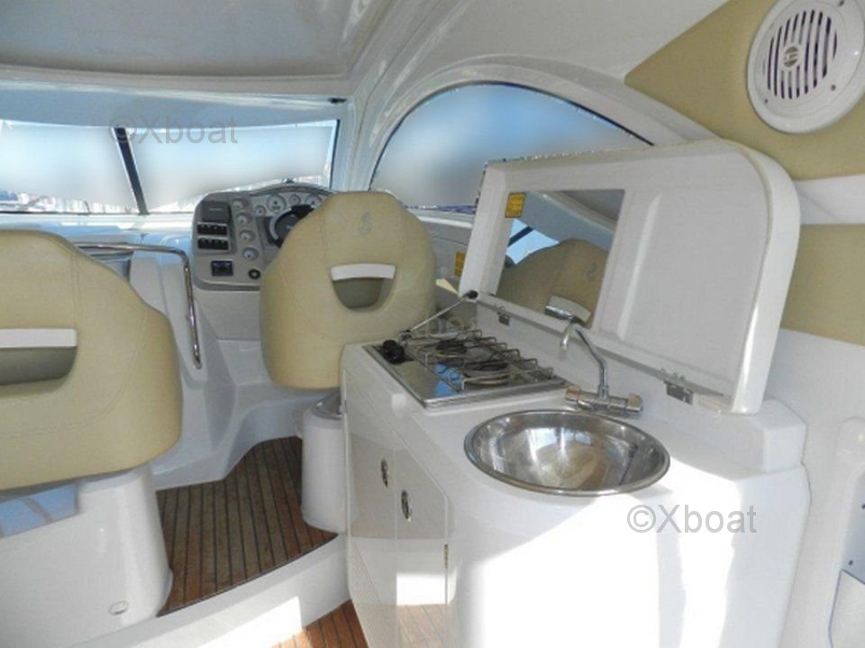 En el interior, el barco cuenta con dos cabinas, incluyendo una cabina principal con una cama doble y una cabina de invitados con literas. El baño está equipado con una ducha y un inodoro eléctrico. La cocina está bien equipada con un fregadero, un refrigerador y un horno microondas.