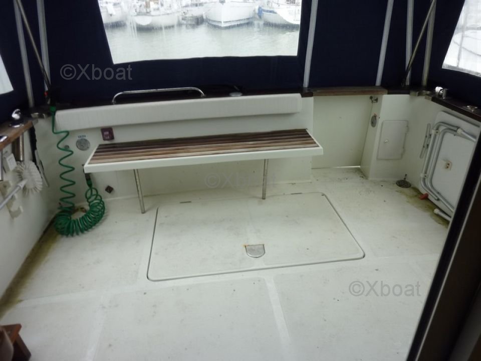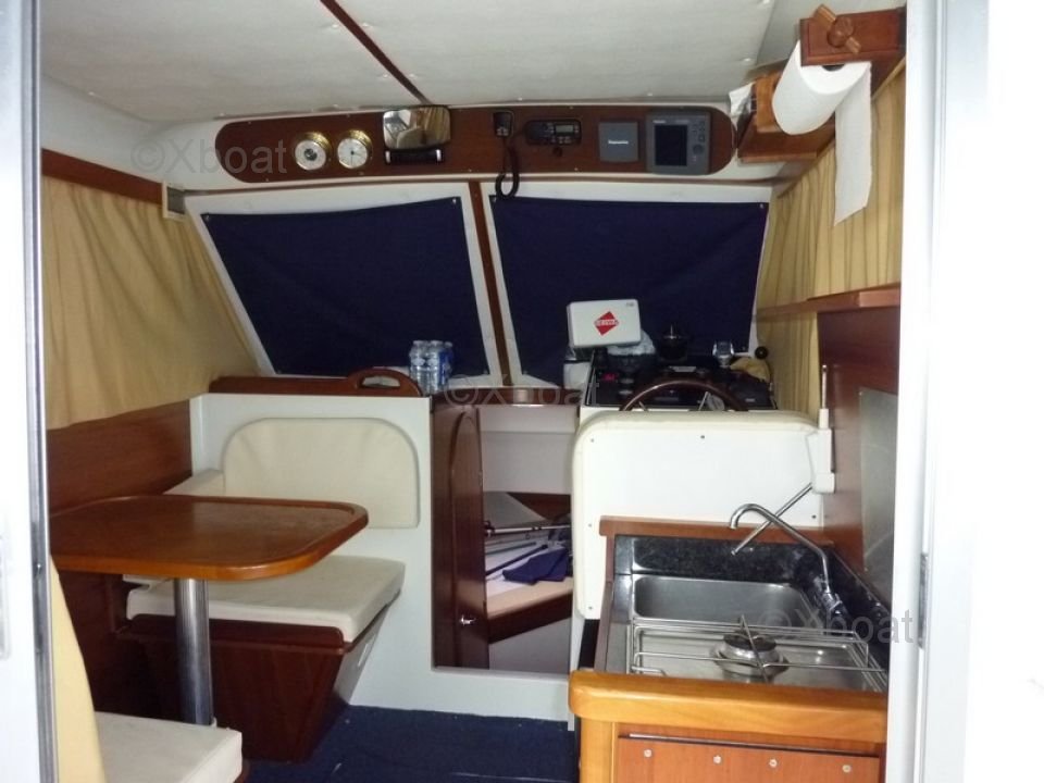 Confort y Equipamiento: La cubierta principal está diseñada con una configuración walkaround, proporcionando acceso fácil a todas las áreas del barco. La cubierta de popa es espaciosa y bien equipada, con asientos cómodos y amplio espacio de almacenamiento. El timón es ergonómico, con instrumentos de navegación modernos y un tablero intuitivo.