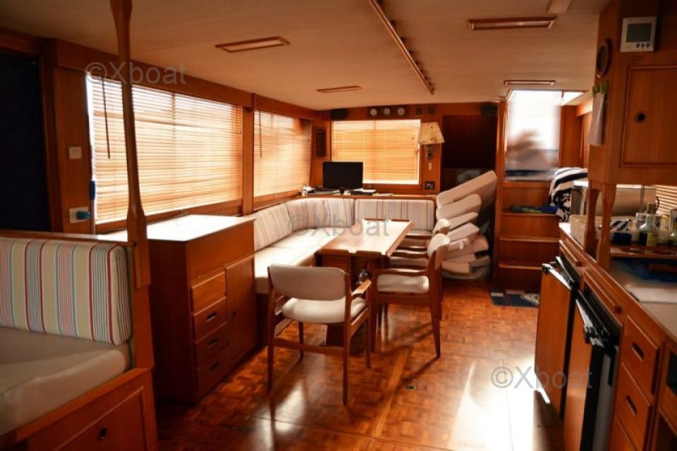 Distribución Interior: El interior del Grand Banks 49 es espacioso y lujoso, con cabinas cómodas y espacios de vida bien diseñados. Cuenta con tres cabinas, incluyendo una suite principal con baño privado, así como dos cabinas de invitados. La sala de estar está equipada con grandes ventanas que ofrecen una vista impresionante del exterior.