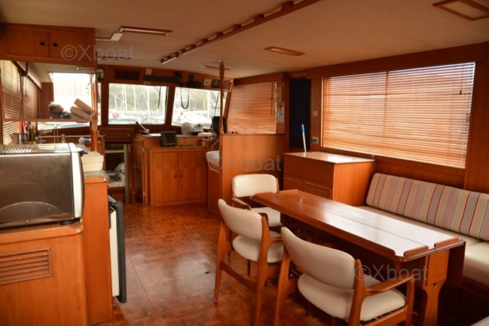 Especificaciones Técnicas: El barco está construido con un casco reforzado con fibra de vidrio, asegurando una durabilidad y resistencia excepcionales. La cubierta está equipada con barandillas de acero inoxidable y grandes áreas de cubierta en la popa y en la proa, ideales para relajarse.