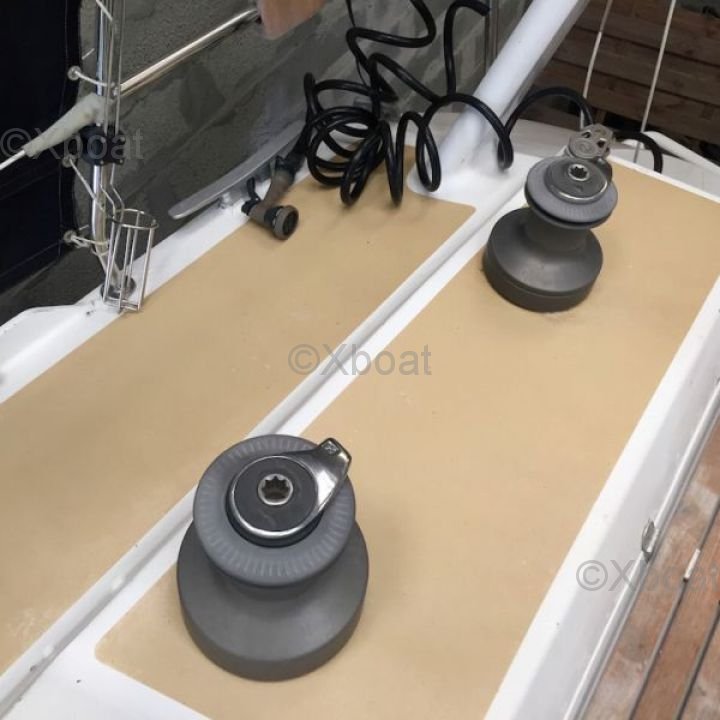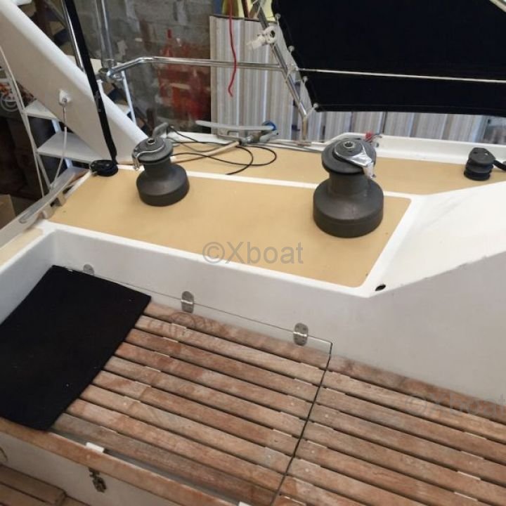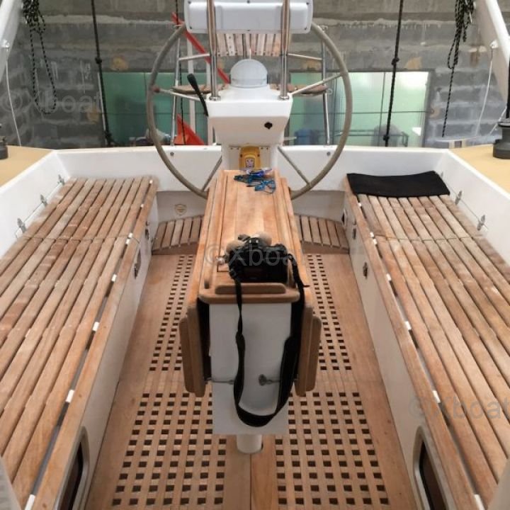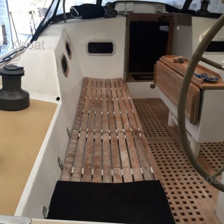 El OVNI 445 está construido con un casco de poliéster reforzado con fibra de vidrio, proporcionando una excelente resistencia y una larga vida útil. La quilla de plomo asegura una estabilidad óptima, mientras que la cubierta de teca o composite ofrece una superficie antideslizante y estética.