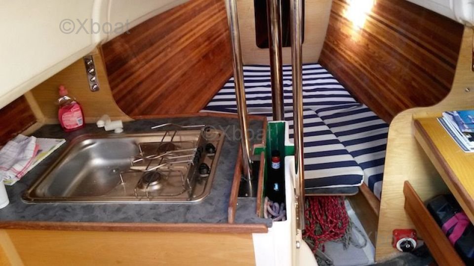 En el interior, el barco cuenta con un espacio de vida funcional con una cabina principal, una cocina compacta y áreas de almacenamiento inteligentes. El diseño interior está pensado para maximizar el espacio disponible ofreciendo el mínimo confort para largos días en el mar.