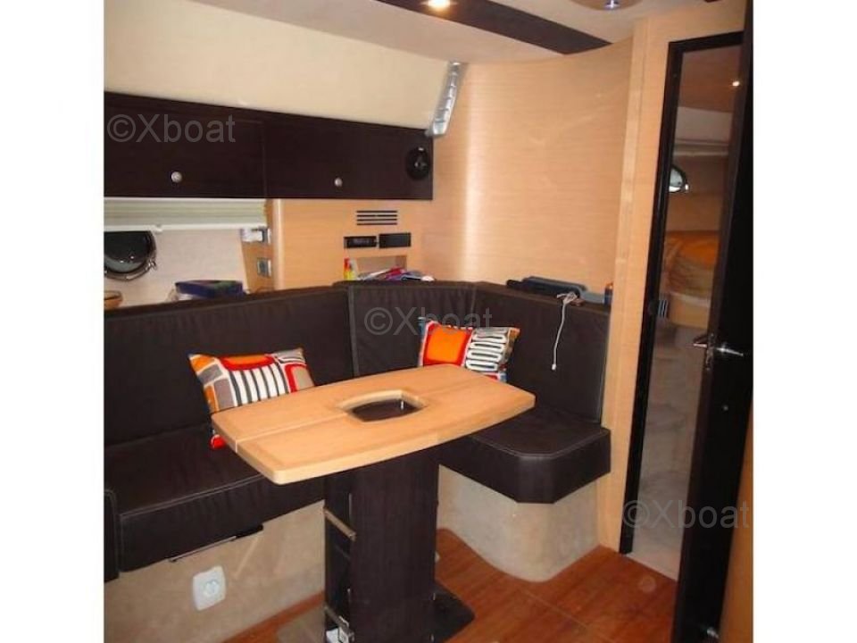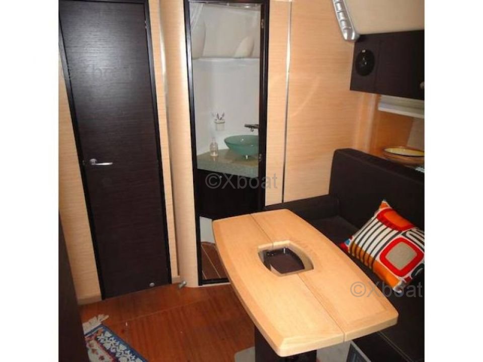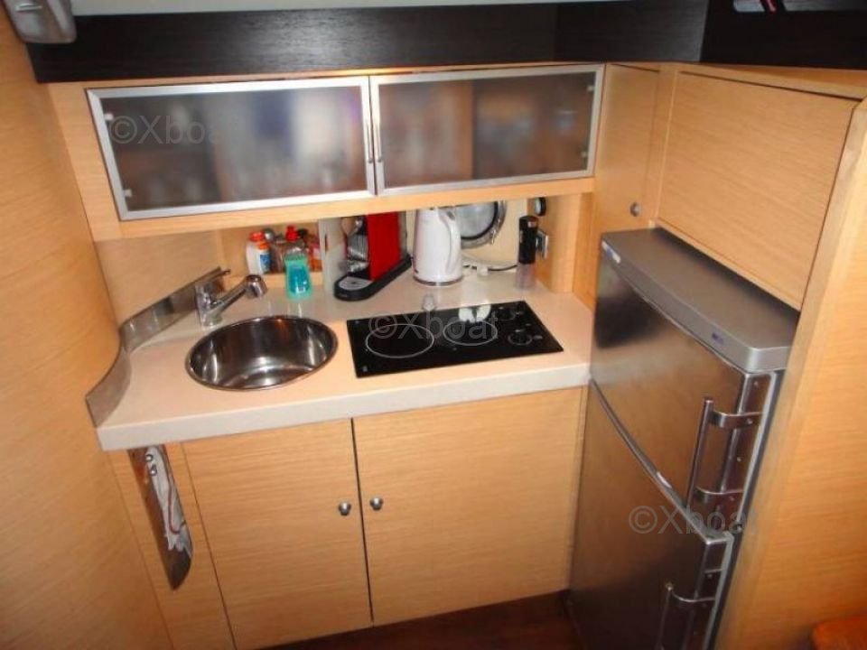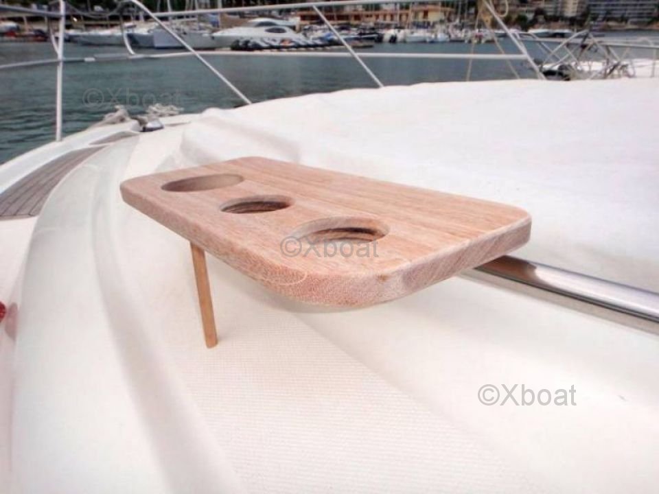 Distribución interior: El interior del barco es espacioso y luminoso, con acabados de alta calidad. Cuenta con tres cabinas, incluyendo una suite propietaria en la proa, ofreciendo un espacio de vida cómodo. La cocina está bien equipada, y el salón está diseñado para maximizar el confort y el espacio de vida. Los materiales utilizados son duraderos y estéticos, proporcionando una atmósfera cálida y acogedora.