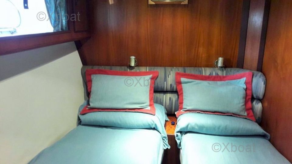 Distribución interior: Este yate cuenta con tres cabinas, cada una ofrece un confort óptimo. La cabina principal está equipada con una gran cama doble, mientras que las dos cabinas de invitados ofrecen camas individuales o literas. El baño es espacioso e incluye una ducha separada.