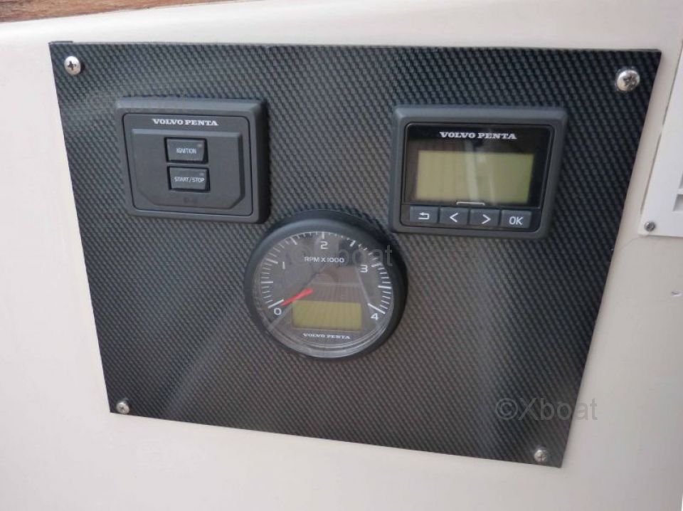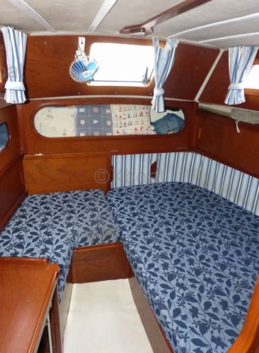 En el interior, el barco tiene tres cabinas dobles, un baño con ducha y una cocina bien equipada. El diseño interior es funcional y elegante, con acabados de alta calidad.