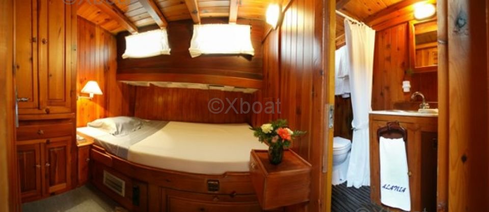 En el interior, la Goélette ofrece un espacio de vida cómodo con cabinas espaciosas y bien equipadas. La cocina está equipada con todo el equipo necesario para viajes prolongados, y la cubierta de popa está diseñada para ofrecer una vista despejada del horizonte.
