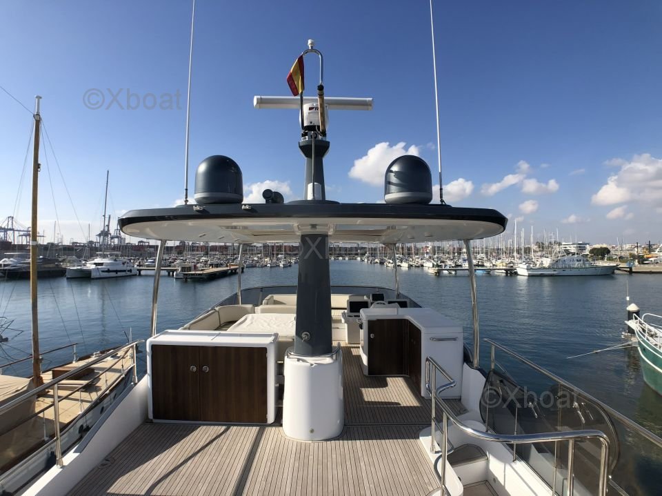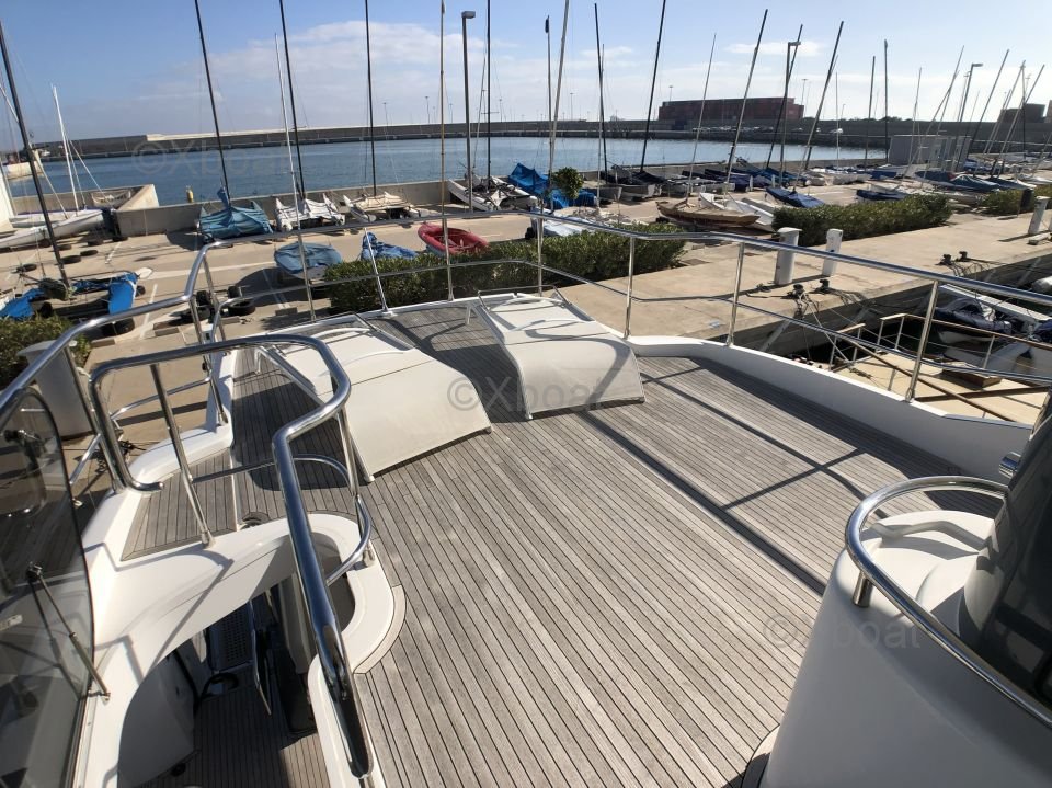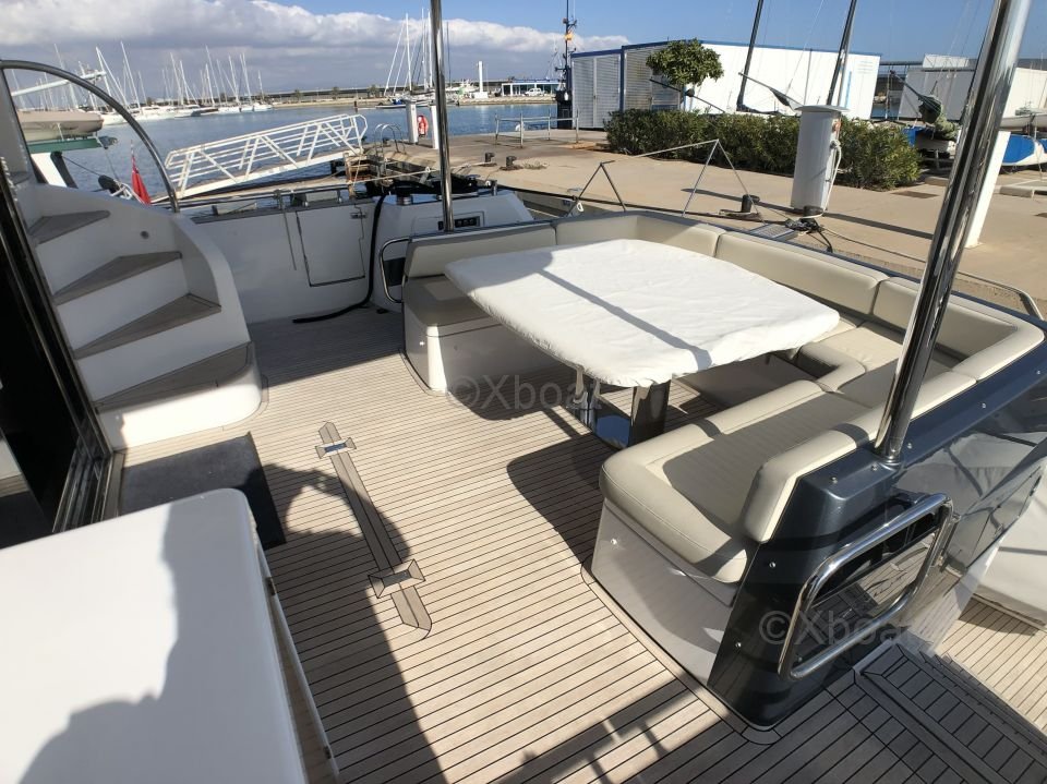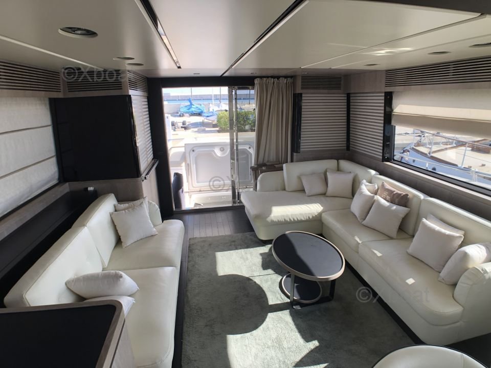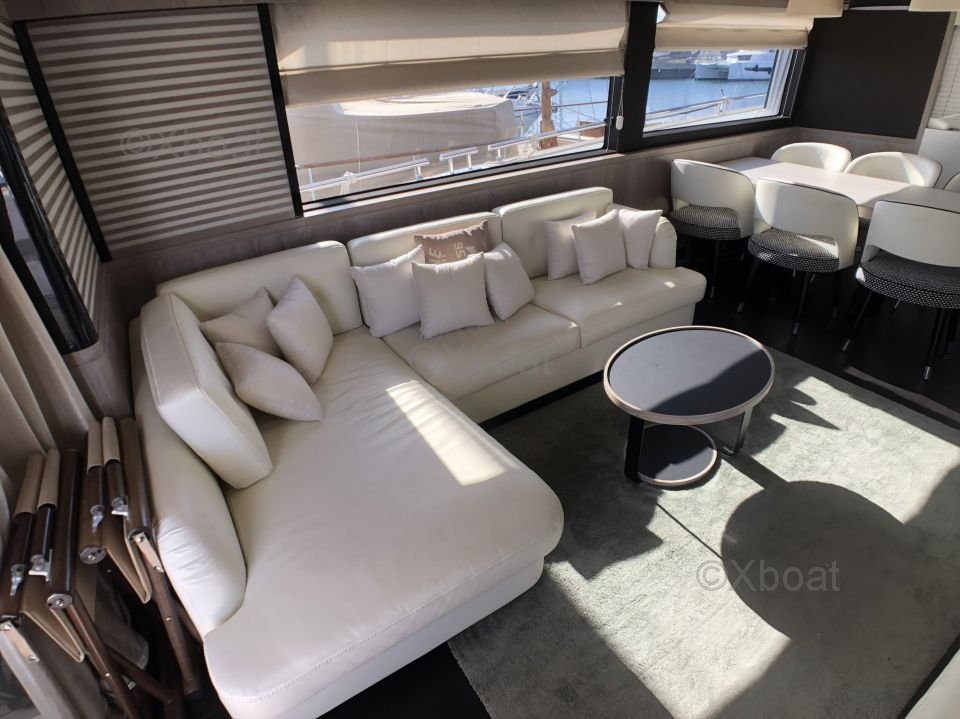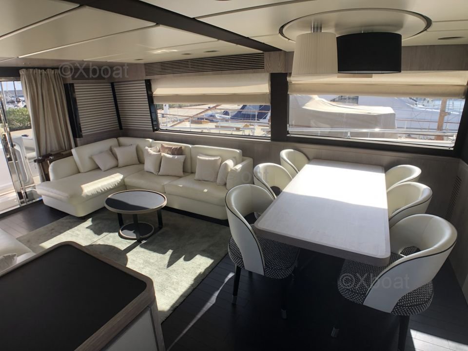 Espacios exteriores: La cubierta principal es espaciosa y ofrece un salón al aire libre con una mesa de comedor, un área de relajación y una barra. La cubierta de vuelo está equipada con una segunda estación de timón, un solárium y espacio adicional para relajarse.