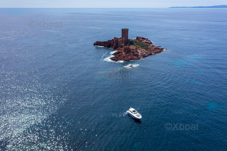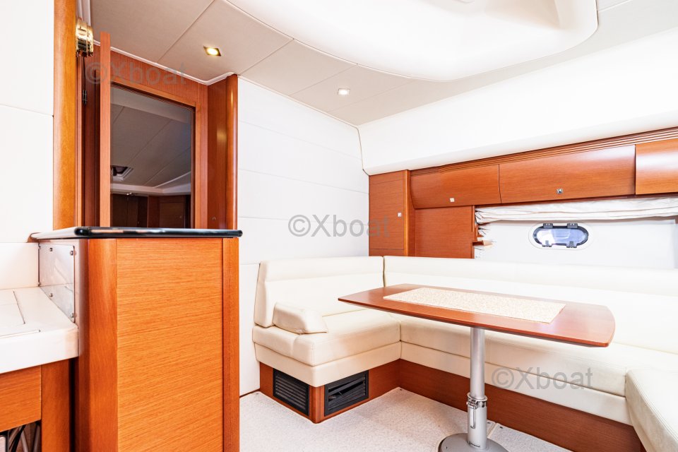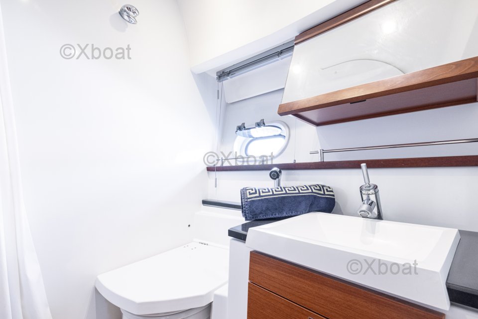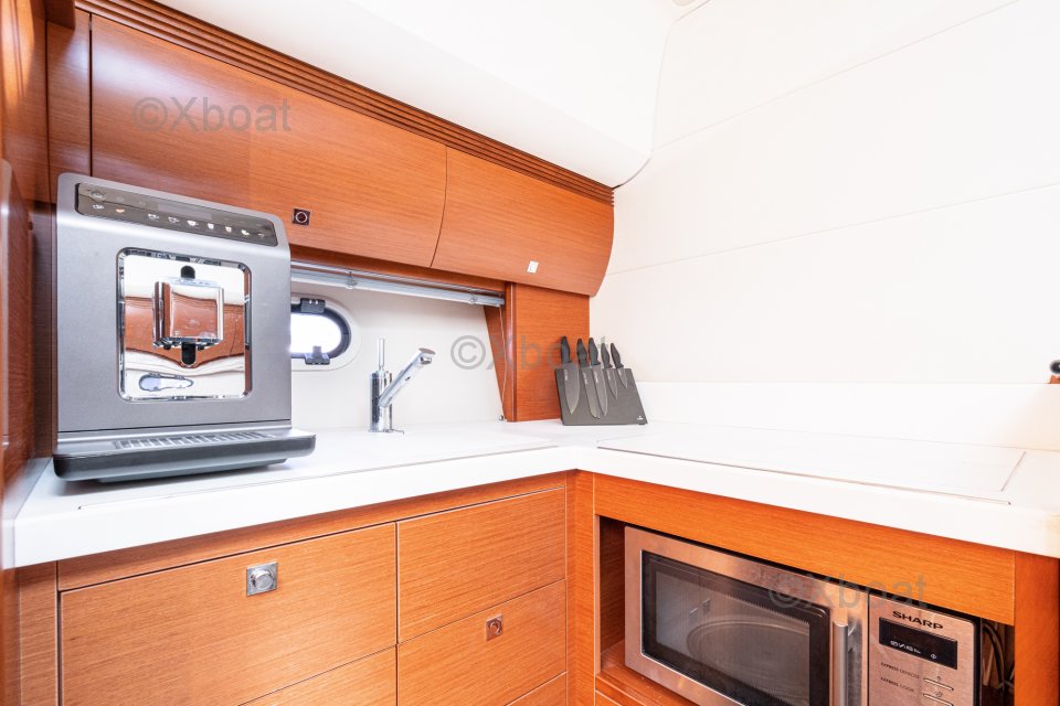 Diseño interior: El barco cuenta con tres cabinas, incluyendo una cabina principal con baño privado, así como dos cabinas para invitados. La sala de estar es espaciosa y luminosa, con una gran ventana que ofrece una vista despejada del exterior. La cocina está bien equipada y funcional, ideal para preparar comidas en el mar.