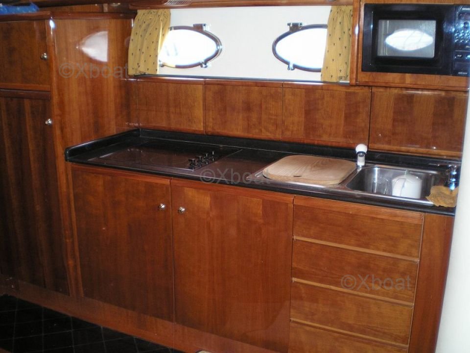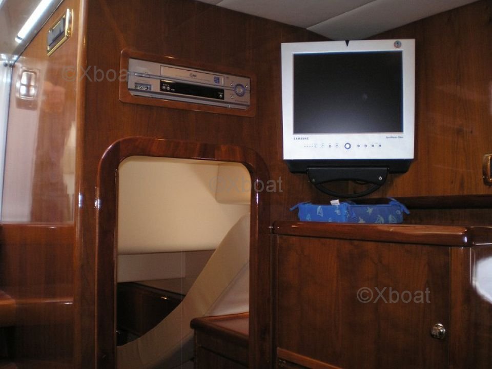 El interior del barco es espacioso y lujoso, con acabados de madera preciosa y equipos modernos. Cuenta con varias cabinas, cada una ofreciendo el confort óptimo para largos viajes por mar. La cocina está bien equipada con electrodomésticos de alta calidad, y el salón está diseñado para proporcionar un espacio de vida agradable.