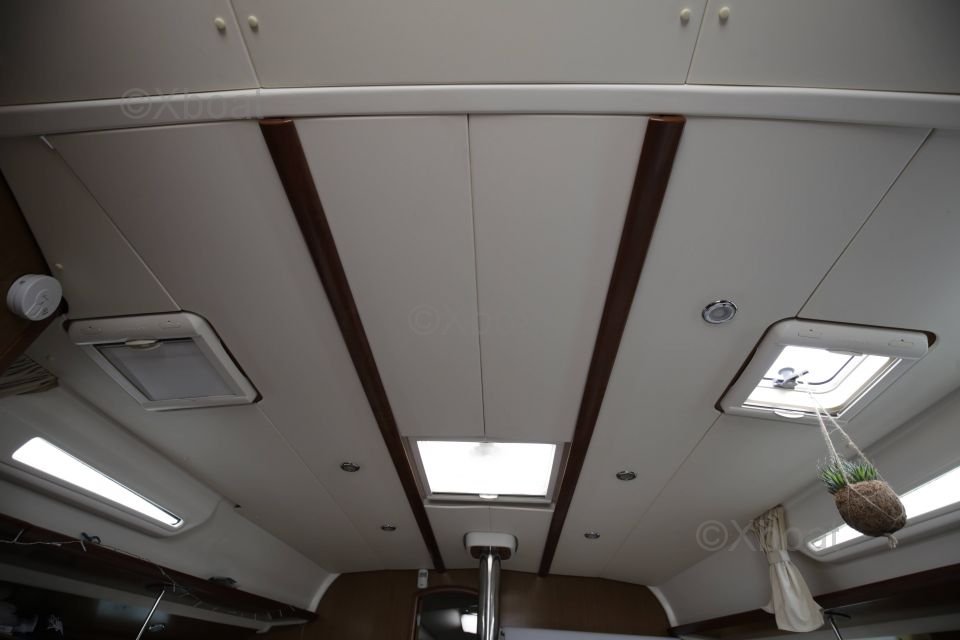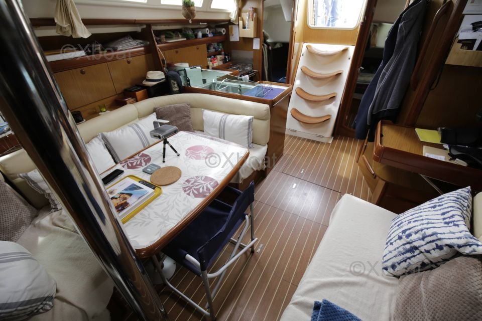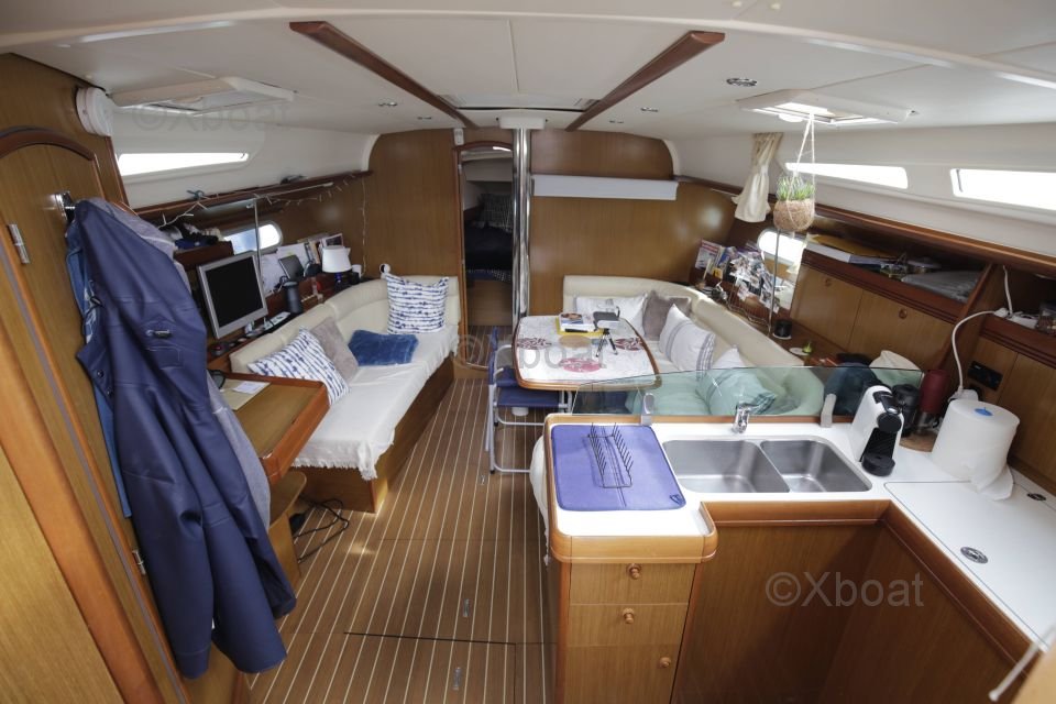 El interior del Sun Odyssey 42i es espacioso y bien distribuido, ofreciendo un confort óptimo para largas travesías. Cuenta con tres camarotes dobles, una cocina bien equipada y un baño completo. Los acabados son meticulosos, con materiales de calidad para una atmósfera cálida y acogedora.